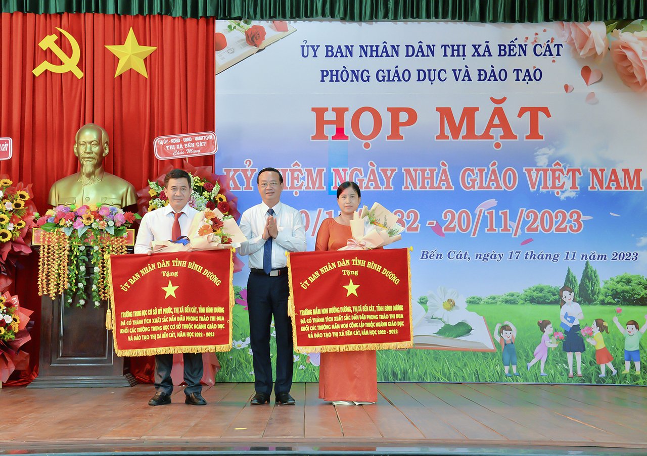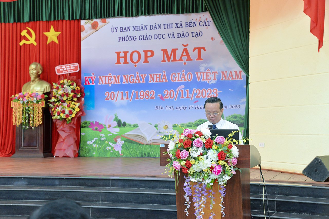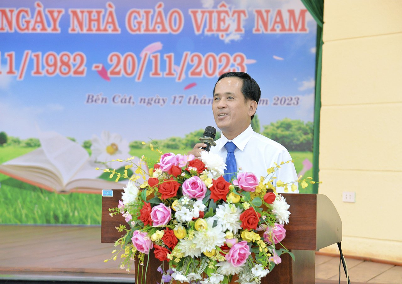 Thay mặt lãnh đạo thị xã, ông Bùi Minh Thạnh - Bí thư Thị ủy gửi lời tri ân, biểu dương những nỗ lực của các thầy, cô giáo trong thời gian qua đã đồng hành trình cùng sự phát triển, đổi mới thị xã Bến Cát và khẳng định lãnh đạo thị xã luôn quan tâm đến sự phát triển của ngành Giáo dục và Đào tạo thị xã. Để ngành Giáo dục và Đào tạo thị xã phát triển bền vững, có nhiều đổi mới sáng tạo thì mỗi thầy, cô giáo hãy là người truyền cảm hứng, tạo động lực cho học sinh về lòng yêu quê hương, yêu đất nước, hiếu thảo với cha mẹ, yêu cái đẹp, đấu tranh với cái xấu,… góp phần vào sự nghiệp ươm mầm hạt giống tương lai trên mảnh đất Bến Cát hào hùng này.