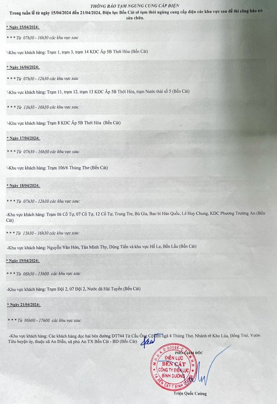Thông báo mất điện (từ ngày 15.04.2024 đến ngày 21.04.2024) 15:01 03/04/2024 In Nghe A Chia sẻ THÔNG BÁO TẠM NGƯNG CUNG CẤP ĐIỆN image.png 593.86 KBTài liệu đính kèmCÙNG CHUYÊN MỤC