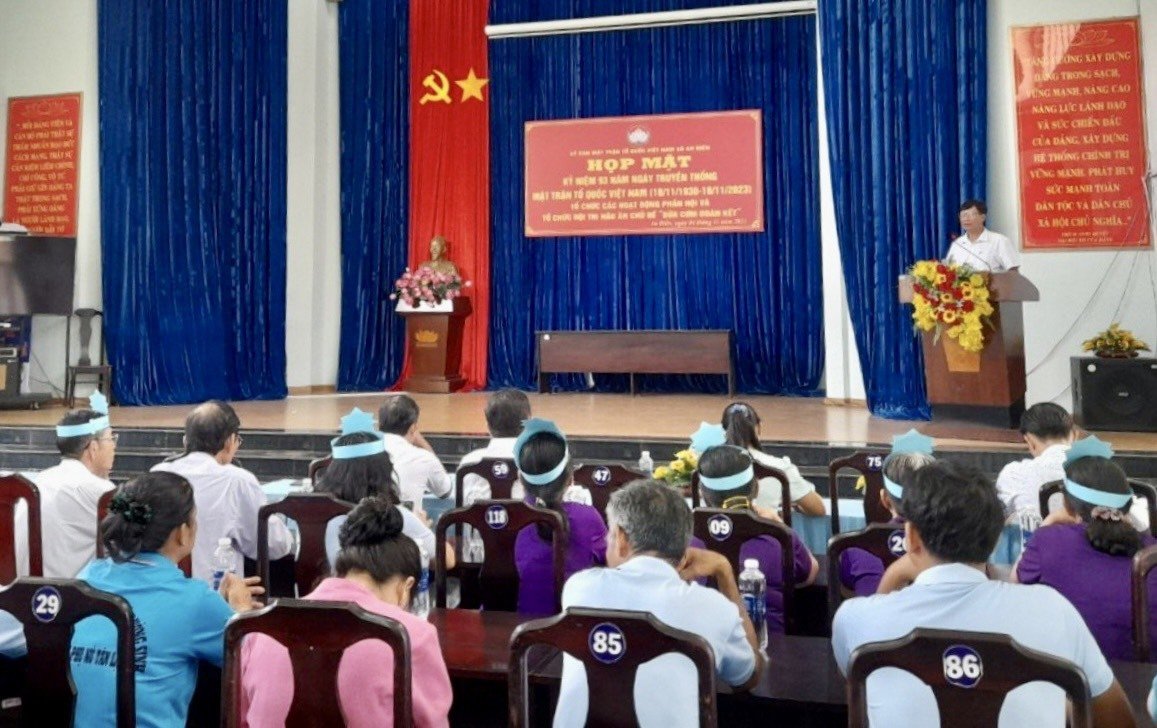 Tại buổi họp mặt, các đại biểu đã cùng nhau ôn lại chặng đường lịch sử và truyền thống cách mạng vẻ vang của Mặt trận Tổ quốc Việt Nam. Phát huy truyền thống vẻ vang của MTTQ Việt Nam, Mặt trận Tổ quốc Việt Nam xã An Điền đã phối hợp với các tổ chức thành viên tuyên truyền, vận động các tầng lớp nhân dân phát huy sức mạnh khối đại đoàn kết toàn dân tộc, hưởng ứng thực hiện có hiệu quả các phong trào thi đua yêu nước, đặc biệt là cuộc vận động “Toàn dân đoàn kết xây dựng nông thôn mới, đô thị văn minh”, góp phần thực hiện thắng lợi các chỉ tiêu, nhiệm vụ phát triển kinh tế - xã hội đảm bảo quốc phòng - an ninh, xây dựng Đảng, hệ thống chính trị, sớm đưa xã An Điền trở thành phường thuộc thị xã Bến Cát trong thời gian tới.