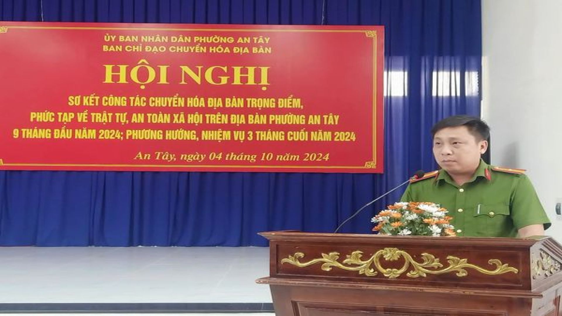 Công tác chuyển hóa địa bàn trọng điểm, phức tạp về trật tự an toàn xã hội (TTATXH) luôn được phường An Tây xem là một trong những nhiệm vụ trọng tâm nhằm góp phần đảm bảo an ninh trật tự trên địa bàn. Để thực hiện có hiệu quả công tác chuyển hóa địa bàn phức tạp về trật tự, an toàn xã hội, Ban chỉ đạo chuyển hóa địa bàn phường đã phân công nhiệm vụ cho các thành viên Ban chỉ đạo cùng chung tay góp sức thực hiện chuyển hóa thành công địa bàn trọng điểm, phức tạp về trật tự, an toàn xã hội. Theo đó, công tác chuyển hóa địa bàn được sự tham gia phối hợp của các đội nghiệp vụ, ban, ngành, đoàn thể ở phường và Ban điều hành các khku phố trong công tác chuyển hóa địa bàn, củng cố hệ thống chính trị và kiện toàn các tổ chức, đoàn thể, lực lượng ở cơ sở; Công an phường tăng cường công tác phối hợp với các ban ngành, đoàn thể, Ban điều hành các khu phố và các công ty để tổ chức họp, tuyên truyền về công tác phòng, chống tội phạm, tệ nạn xã hội, đảm bảo trật tự an toàn giao thông – an toàn phòng chống cháy nổ; tăng cường công tác tuần tra kiểm doát, tuần tra vũ trang ban đêm... nhờ đó tình hình an ninh trật tự được đảm bảo; phạm pháp hình sự đã điều tra làm rõ 24/28 vụ, bắt giữ 55 đối tượng, đạt tỷ lệ 85,71%; Phát hiện, triệt xóa 05 vụ ma túy, bắt giữ 14 đối tượng, qua đó, thu giữ tang vật 2,9673 gam ma túy các loại cùng các tang vật khác có liên quan, đã tiến hành khởi tố 04 vụ - 11 đối tượng, xử lý hành chính 15 vụ - 15 đối tượng ra quyết định xử phạt với số tiền trên 22 triệu đồng; lĩnh vực đấu tranh phòng, chống tội phạm và vi phạm pháp luật về kinh tế, môi trường: phát hiện 02 vụ - 02 đối tượng, thu giữ 72 cây thuốc lá điếu nhập lậu hiệu Jet, 22 cây thuốc lá điếu nhập lậu hiệu Hero; phát hiện 02 vụ - 02 đối tượng sử dụng công cụ kích điện), đang củng cố hồ sơ xử lý vi phạm hành chính theo quy định. Công tác bài trừ, triệt xóa tệ nạn xã hội đã phát hiện, triệt xóa 11 vụ, bắt giữ 63 đối tượng có liên quan...