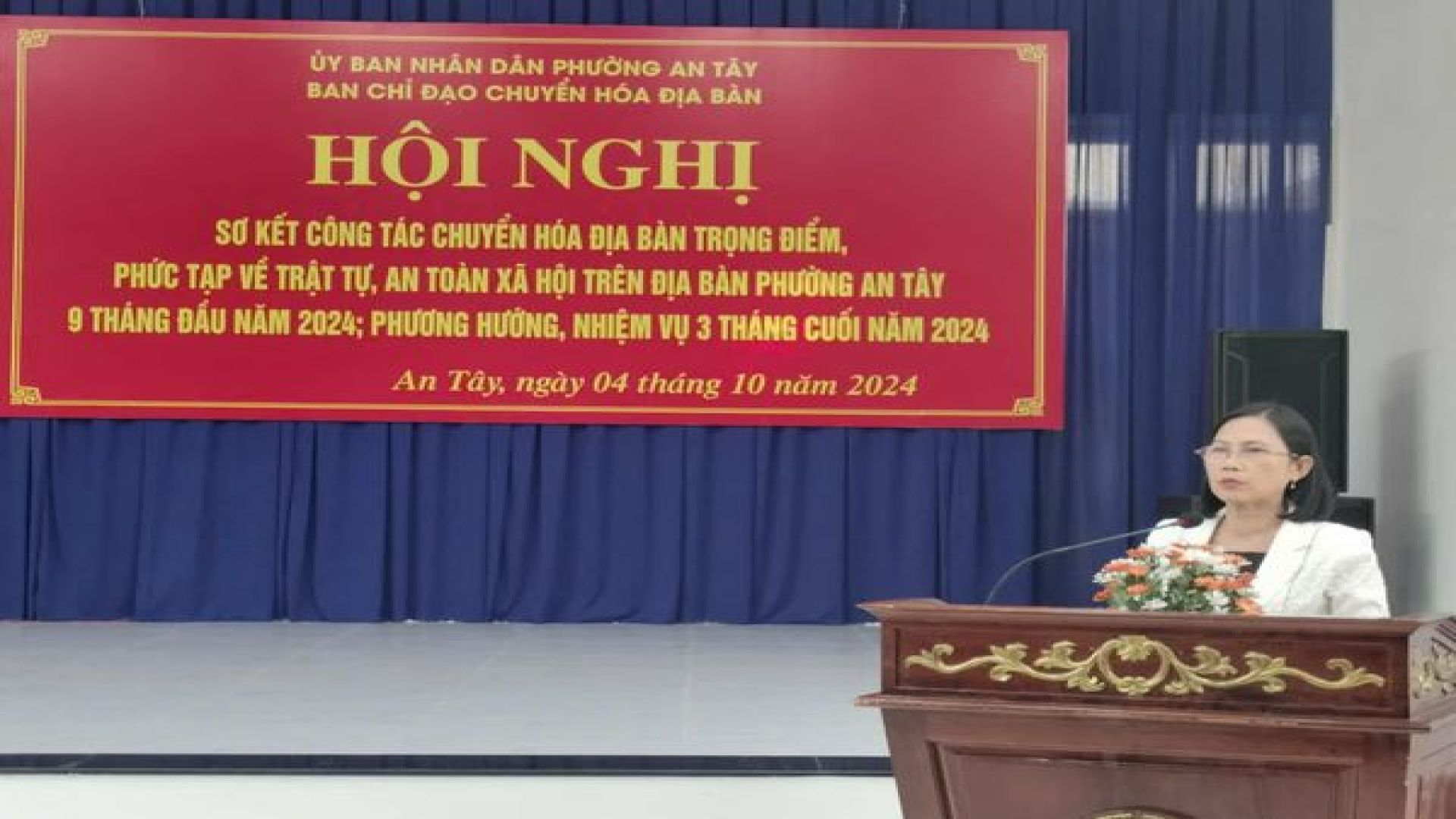 Chiều ngày 04/10, Ban chỉ đạo chuyển hóa địa bàn phường An Tây tổ chức hội nghị sơ kết 9 tháng đầu năm công tác chuyển hóa địa bàn trọng điểm, phức tạp về trật tự, an toàn xã hội. Đến dự có bà Trần Thị Thảo – Phó Chủ tịch UBND thành phố Bến Cát, Trưởng Ban Chỉ đạo 138 thành phố; ông Lê Anh Quý – Trưởng Ban Dân vận Thành ủy.