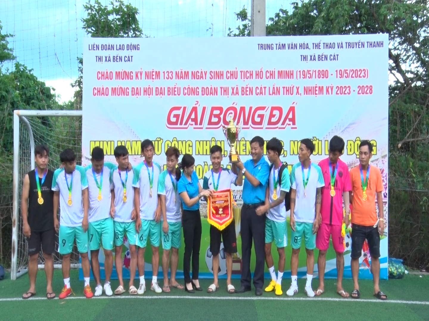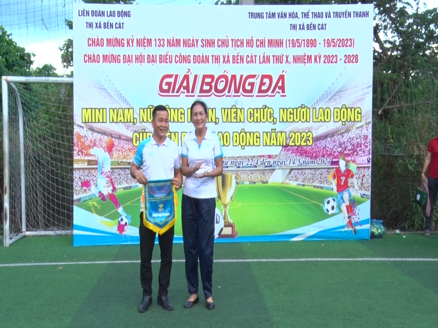 Chiều ngày 14/5, Liên đoàn lao động thị xã phối hợp Trung lâm Văn hóa, Thể thao và Truyền thanh thị xã Bến Cát bế mạc giải Bóng đá mini nam, nữ Cúp Liên đoàn Lao động thị xã năm 2023. Đến dự có ông Lê Nguyễn Thanh Bình – Chủ tịch LĐLĐ thị xã, bà Nguyễn Thị Lý Hoa – Phó Giám đốc Trung tâm.