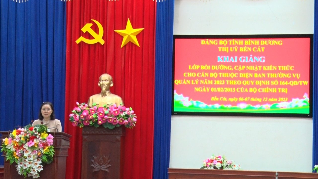 Sáng ngày 6/12, Thị ủy Bến Cát tổ chức lớp bồi dưỡng, cập nhật kiến thức cho cán bộ thuộc diện Ban Thường vụ quản lý. Đến dự có bà Nguyễn Thị Yến Loan – Trưởng Ban Tổ chức Thị ủy.