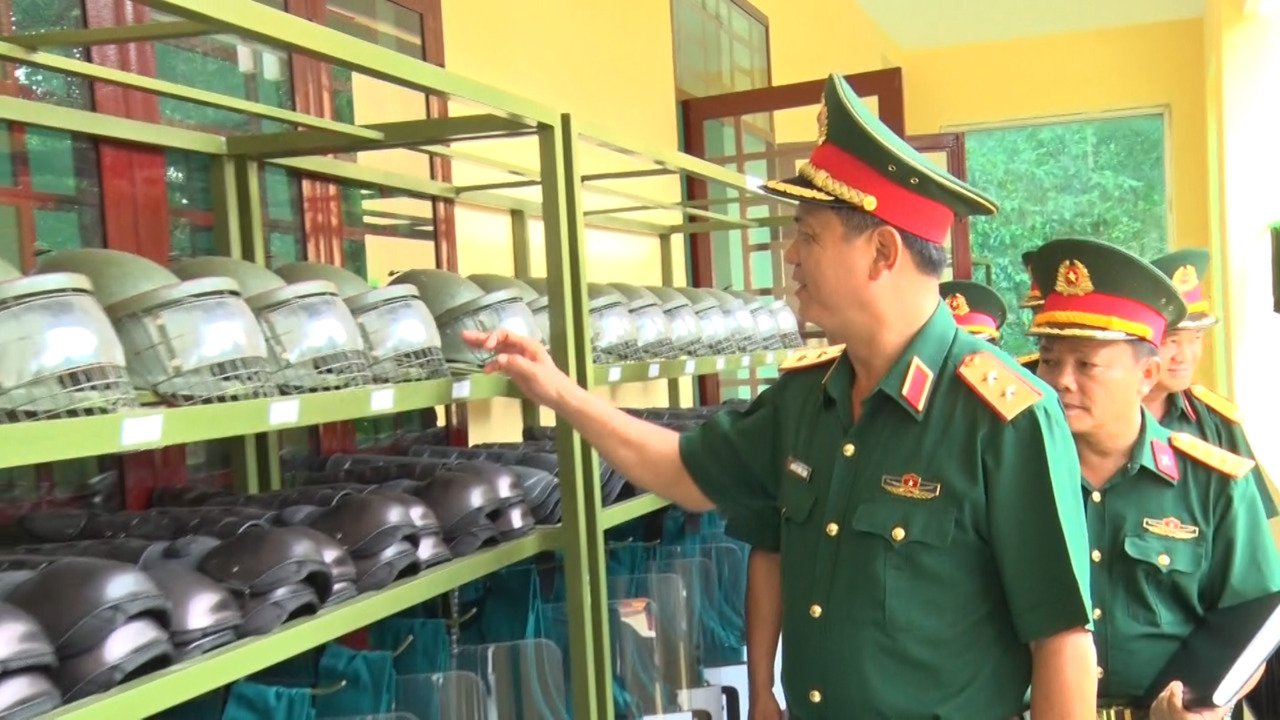 Đoàn kiểm tra Quân khu xem phim phóng sự về hoạt động của chốt Trung đội Dân quân thường trực trong khu công nghiệp của Ban CHQS thị xã phối hợp với các lực lượng tuần tra giữ vững tình hình địa bàn và tham quan chốt Dân quân thường trực.