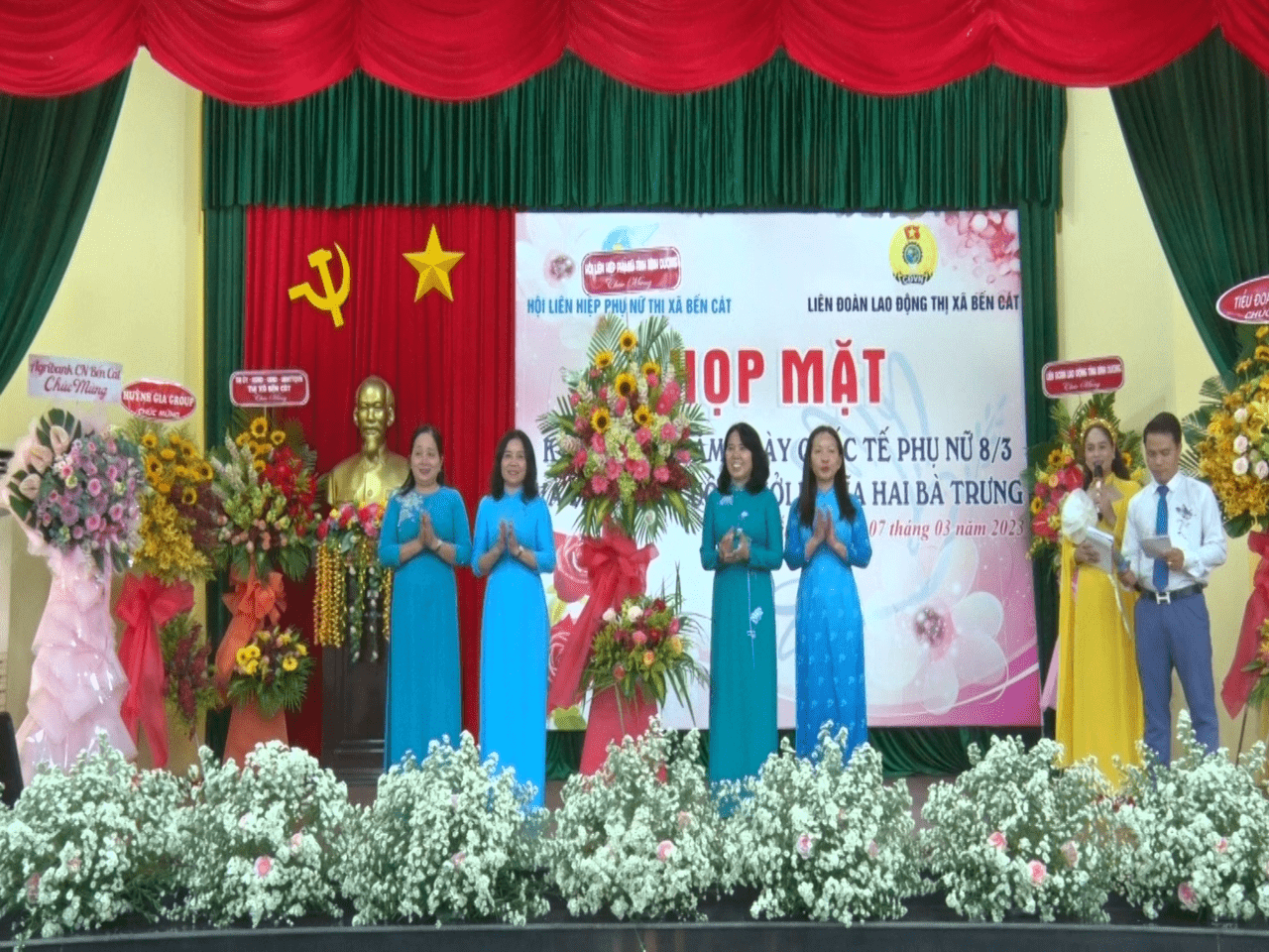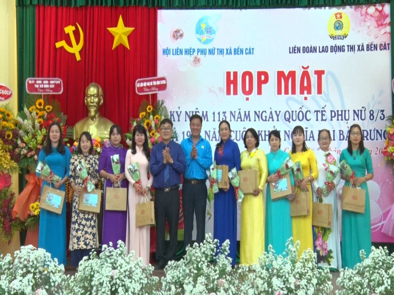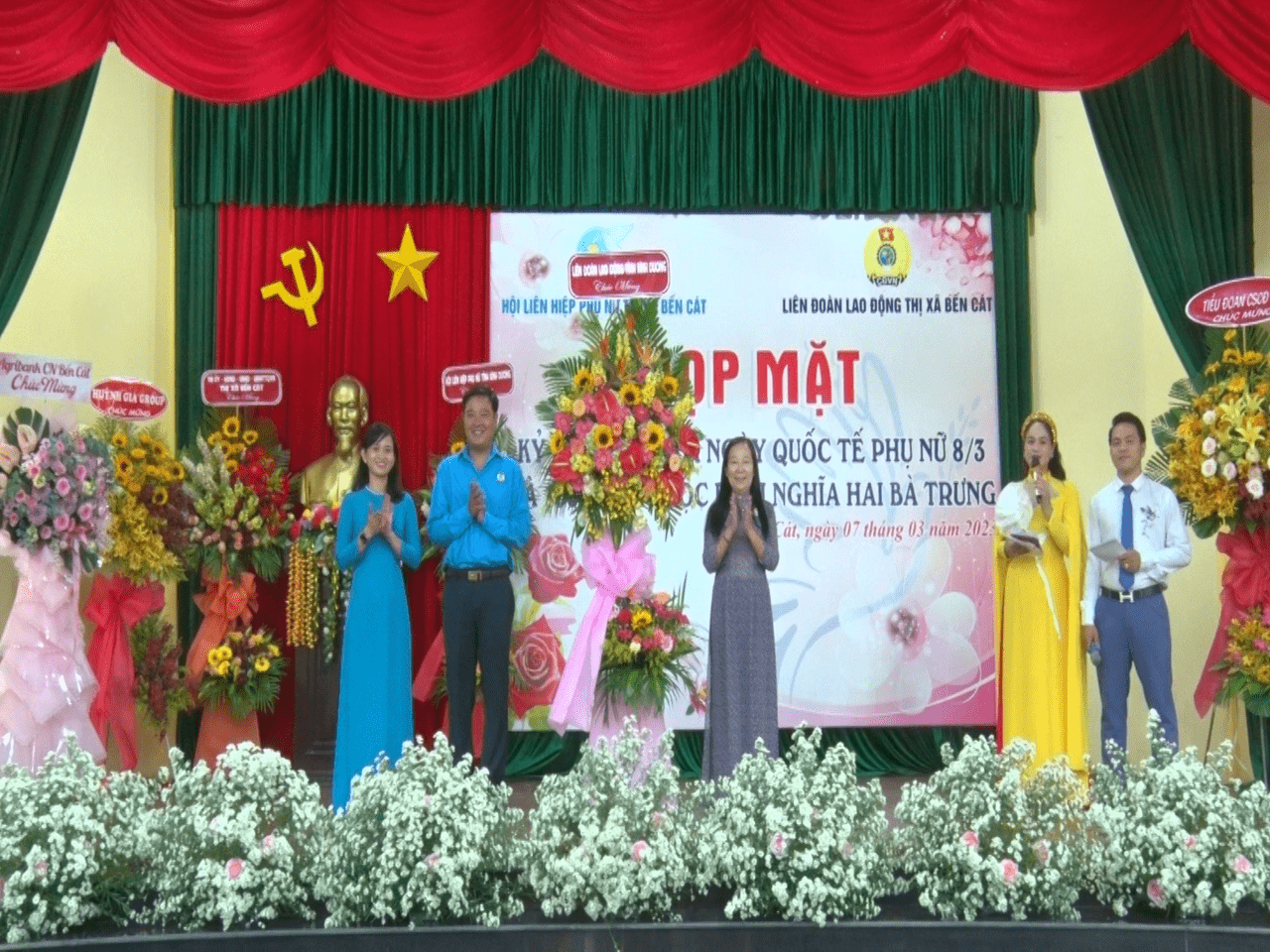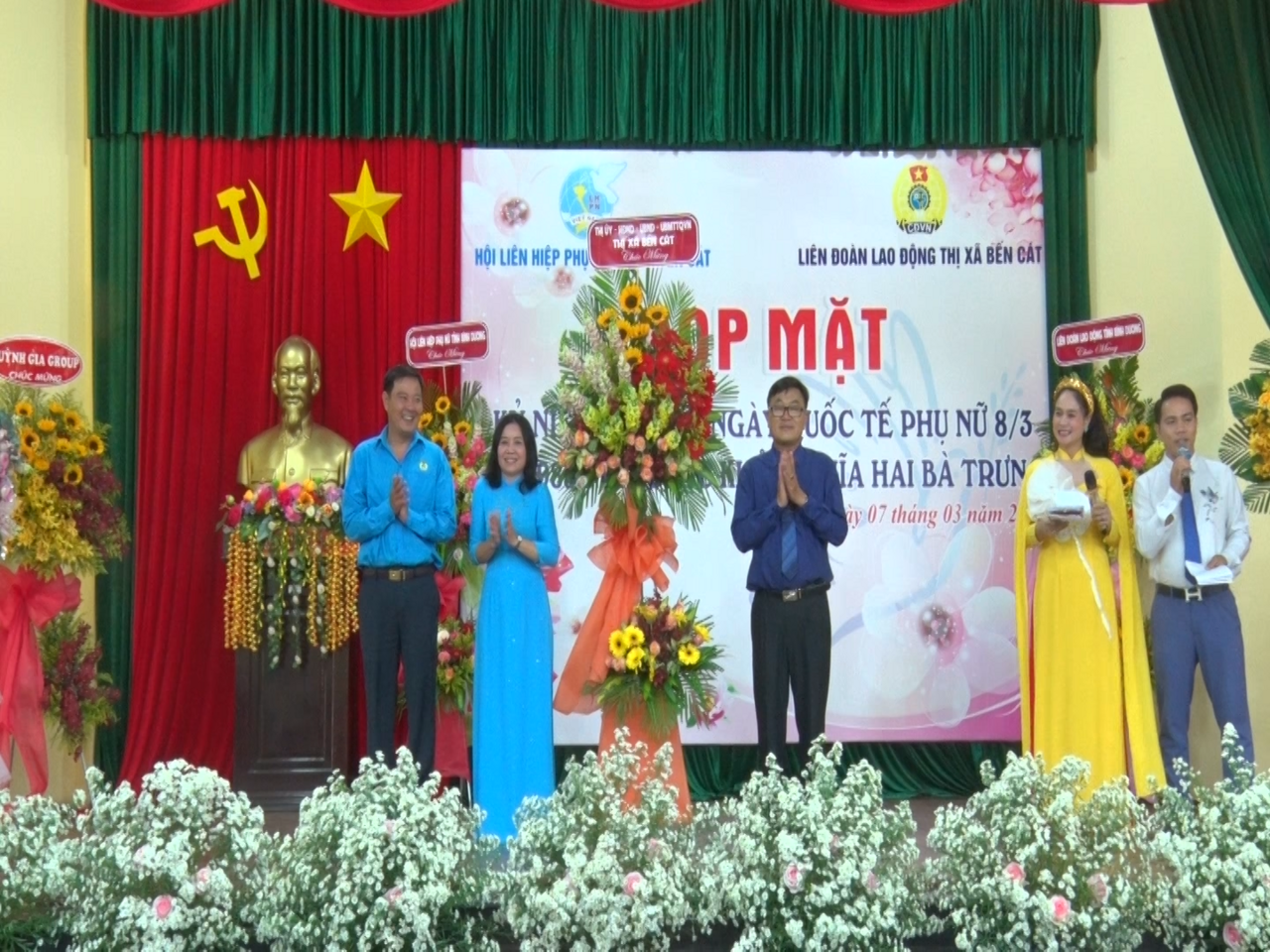 Dịp này, lãnh đạo thị xã Bến Cát gửi đến các đại biểu nữ những bó hoa, quà và lời chúc mừng nhân ngày Quốc tế phụ nữ 8/3.