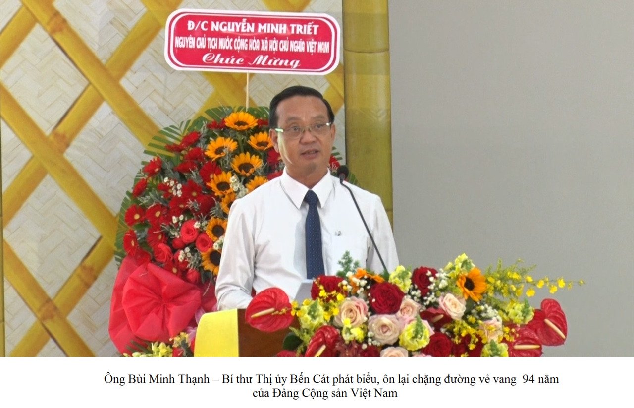 Tại buổi họp mặt, các đại biểu đã cùng nhau ôn lại chặng đường vẻ vang 94 năm của Đảng Cộng sản Việt Nam, khẳng định sự lãnh đạo của Đảng do Chủ tịch Hồ Chí Minh sáng lập và rèn luyện là nhân tố hàng đầu quyết định mọi thắng lợi của cách mạng Việt Nam. Cùng với cả nước, Đảng bộ, chính quyền, nhân dân thị xã luôn một lòng theo Đảng, góp phần trong công cuộc đấu tranh giành độc lập dân tộc, bảo vệ và xây dựng Tổ quốc. Với sự đoàn kết, nỗ lực, quyết tâm của toàn Đảng bộ, chính quyền và Nhân dân, cộng đồng doanh nghiệp trên địa bàn, năm 2023, thị xã Bến Cát đã khắc phục khó khăn, tiếp tục có những chuyển biến tích cực, đạt được những kết quả quan trọng, khá toàn diện trên tất cả các lĩnh vực. Trong đó, đạt và vượt 100% chỉ tiêu, nhiệm vụ Nghị quyết đã đề ra, với 11 chỉ tiêu vượt và tăng cao so với cùng kỳ năm 2022, góp phần quan trọng xây dựng Đảng bộ, chính quyền Bến Cát trong sạch, vững mạnh, hoạt động hiệu lực, hiệu quả. Theo đó, kinh tế thị xã tiếp tục phát triển nhanh và ổn định với tốc độ tăng trưởng 12,1%, cơ cấu kinh tế chuyển dịch đúng hướng. Sắp tới đây, nếu được trung ương thống nhất thông qua, thị xã sẽ chính thức trở thành thành phố trực thuộc tỉnh và đón nhận Huân chương lao động hạng nhất.
