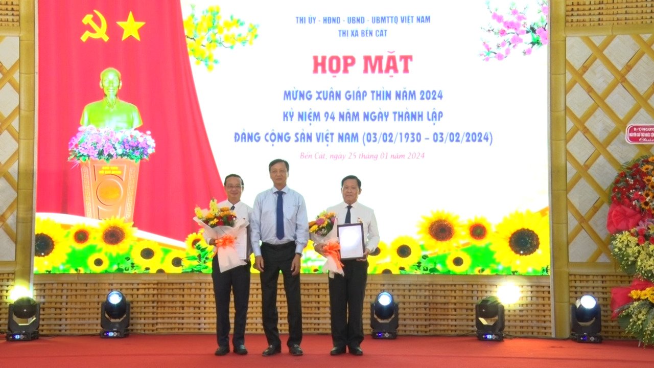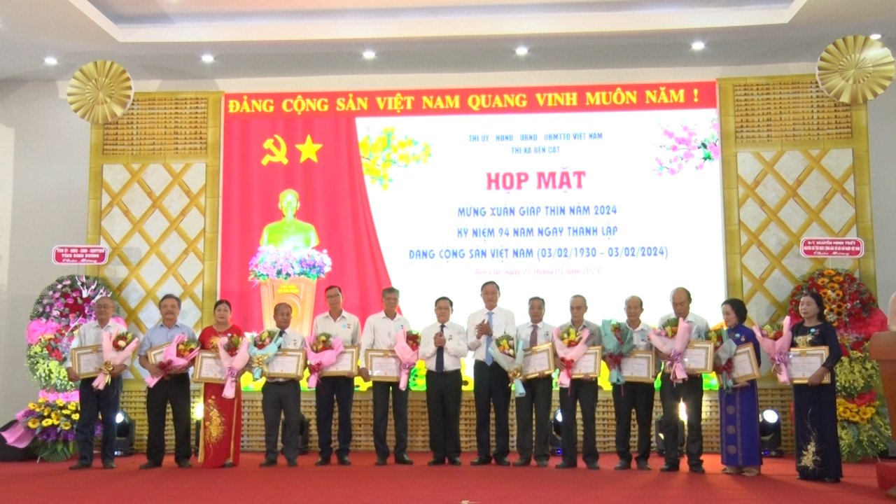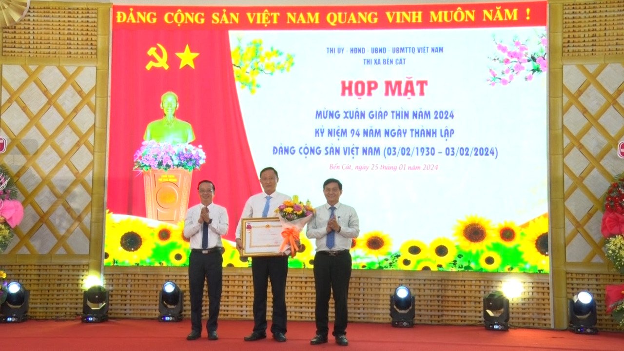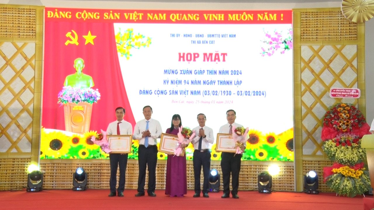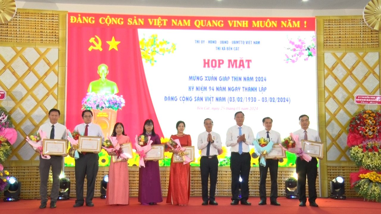 Dịp này, Bến Cát vinh dự có nhiều tập thể, cá nhân đón nhận Huân chương lao động hạng 3 của Chủ tịch nước Cộng hòa XHCN Việt Nam, 2 bằng khen của Thủ tướng Chính phủ, 2 kỷ niệm chương của Ban Nội chính Trung ương; Thị ủy Bến Cát khen thưởng cho các tập thể hoàn thành xuất sắc công tác xây dựng Đảng năm 2023. Ngoài ra, Thị ủy Bến Cát cũng trao huy hiệu 30 đến 60 năm tuổi Đảng cho các đảng viên lão thành.