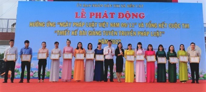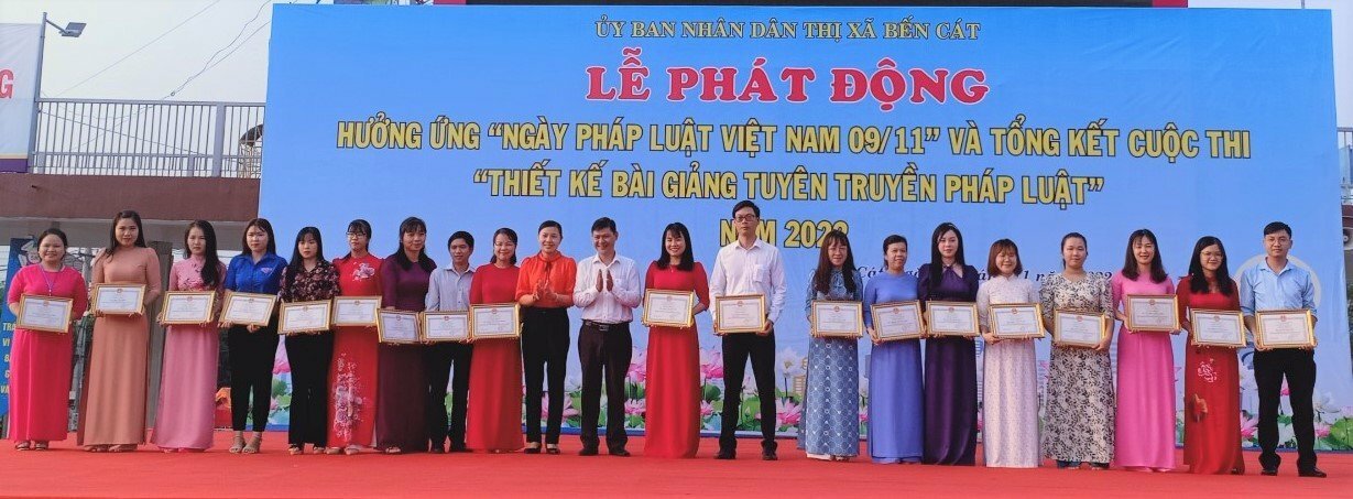 Dịp này, UBND thị xã đã khen thưởng cho 48 tập thể, cá nhân đạt giải cuộc thi “Thiết kế bài giảng tuyên truyền pháp luật” thị xã Bến Cát năm 2022.