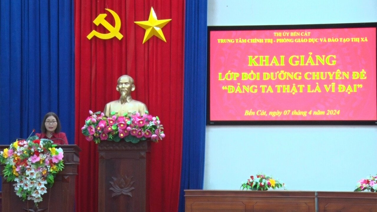 Ngày 07/4, Trung tâm Chính trị thị xã Bến Cát phối hợp cùng Phòng Giáo dục và Đào tạo thị xã Bến Cát tổ chức lớp bồi dưỡng chuyên đề “Đảng ta thật là vĩ đại” cho gần 200 học viên là giáo viên các trường trung học cơ sở trên địa bàn thị xã.