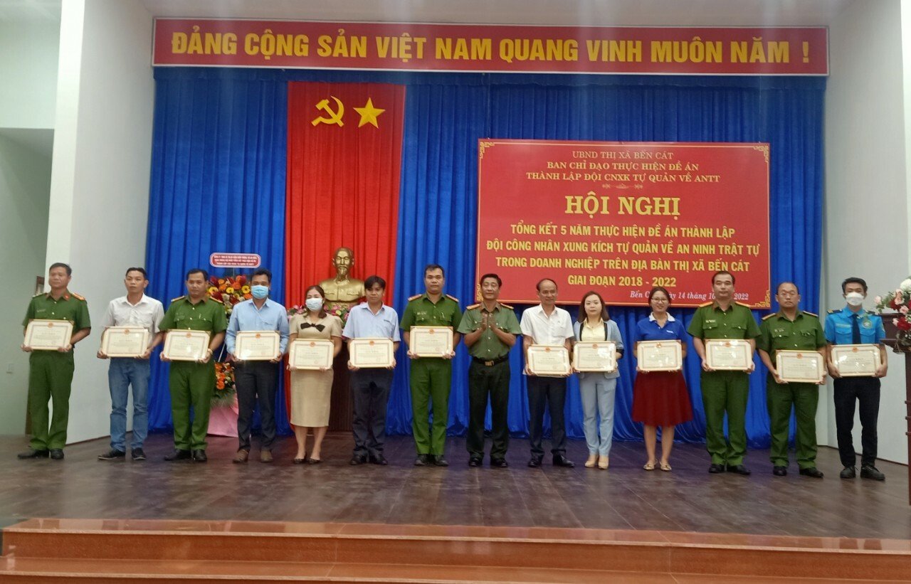 Dịp này, UBND thị xã Bến Cát đã trao tặng giấy khen cho 26 tập thể và 37 cá nhân có thành tích xuất sắc trong 05 năm triển khai thực hiện Đề án Đội CNXK tự quản về ANTT.