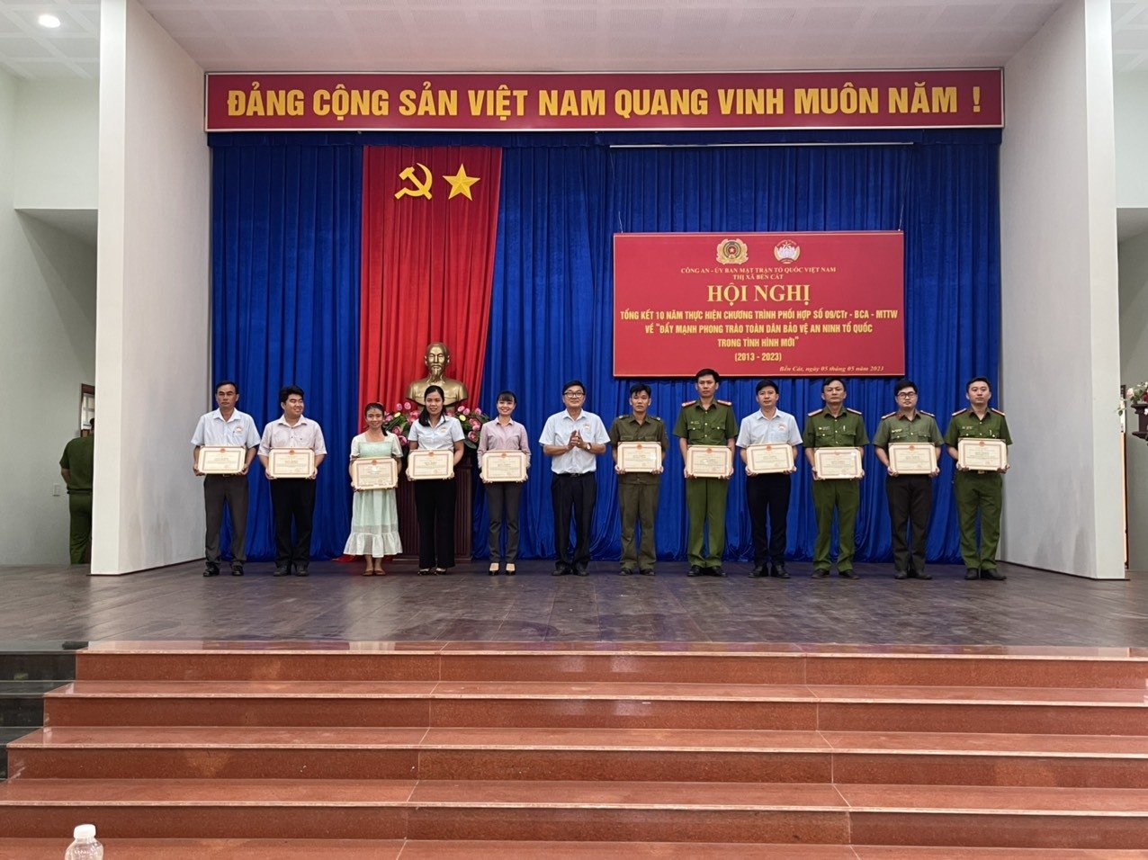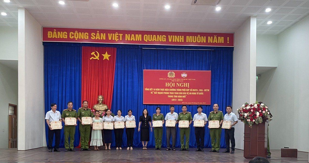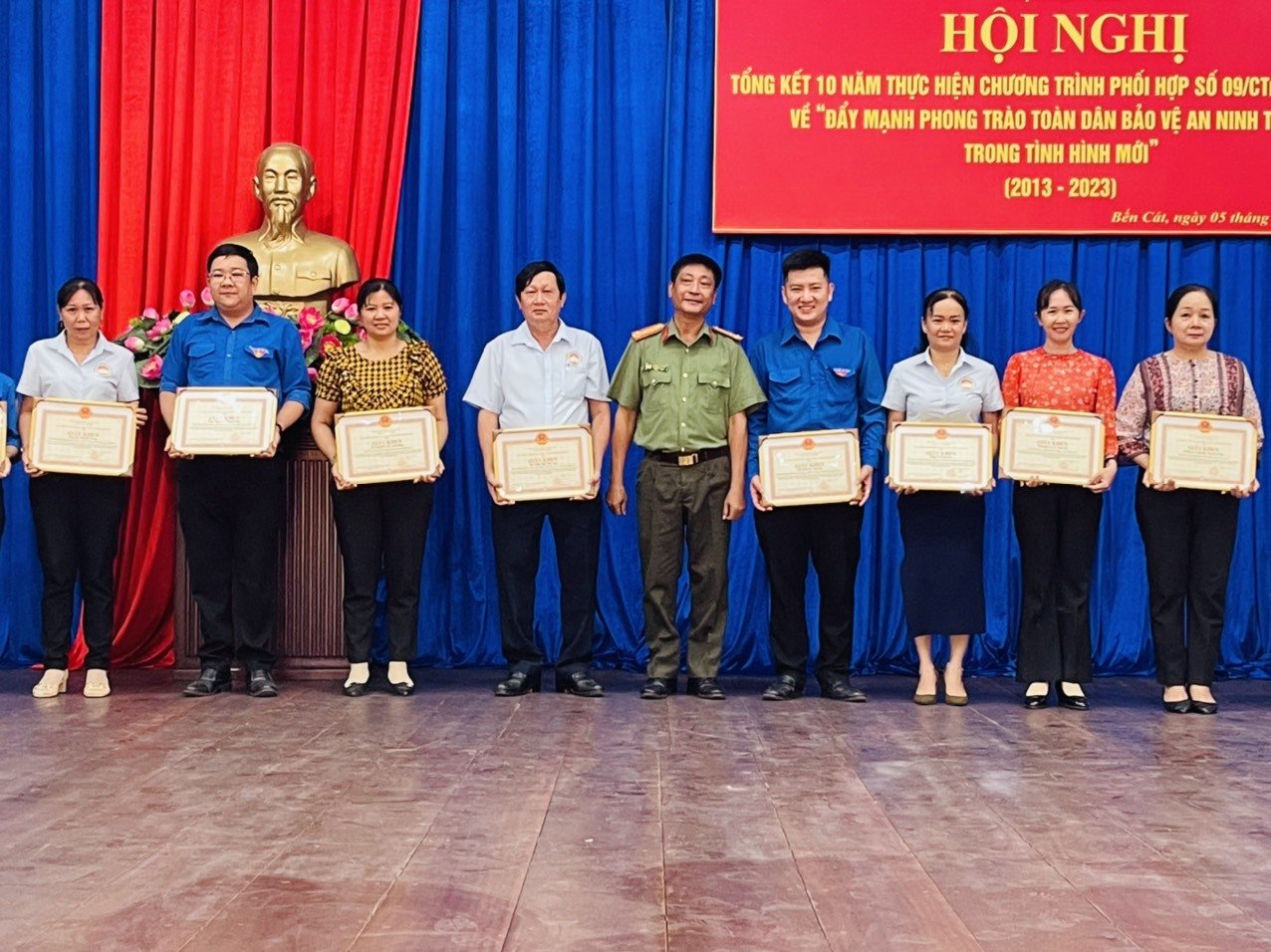 Dịp này, UBND thị xã Bến Cát đã khen thưởng cho 16 tập thể và 30 cá nhân có thành tích xuất sắc trong phong trào toàn dân bảo vệ an ninh Tổ quốc giai đoạn 2013-2023.