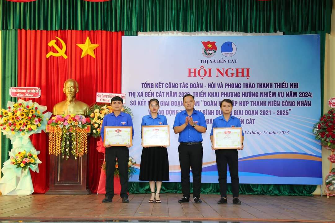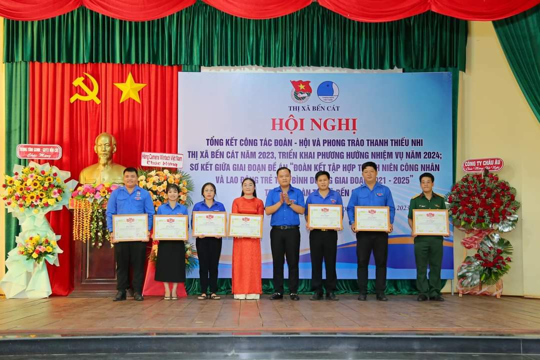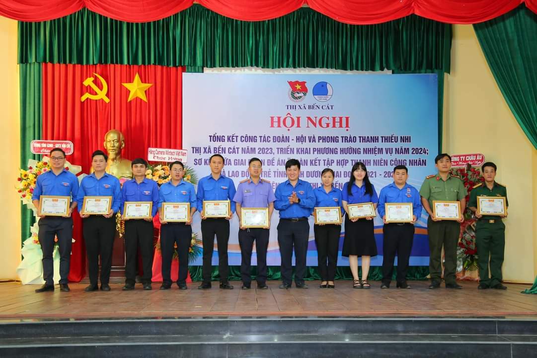 Dịp này, Ban thường vụ Thị đoàn Bến Cát đã trao tặng Bằng khen của Tỉnh đoàn cho 03 tập thể và 07 cá nhân; trao giấy khen của Ban chấp hành Thị đoàn cho 14 tập thể và 12 cá nhân thuộc Chi đoàn cơ sở Khối cơ quan đã có thành tích xuất sắc trong công tác Đoàn và phong trào thanh thiếu nhi năm 2023.
