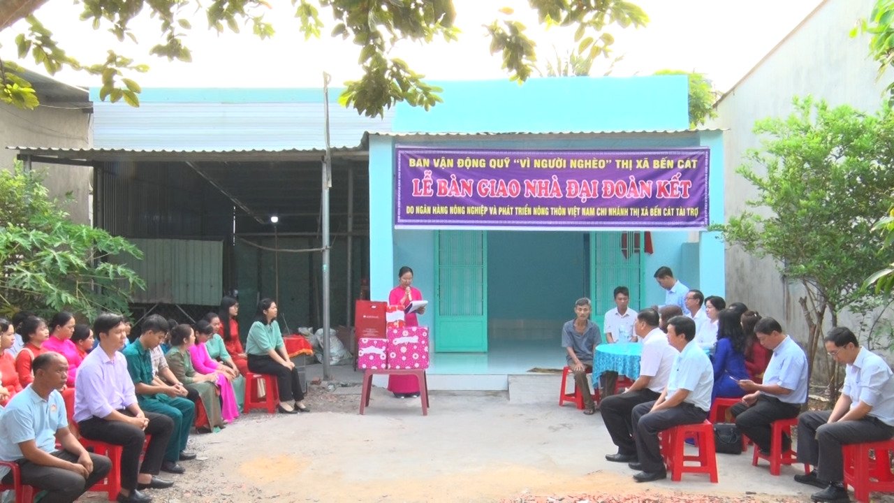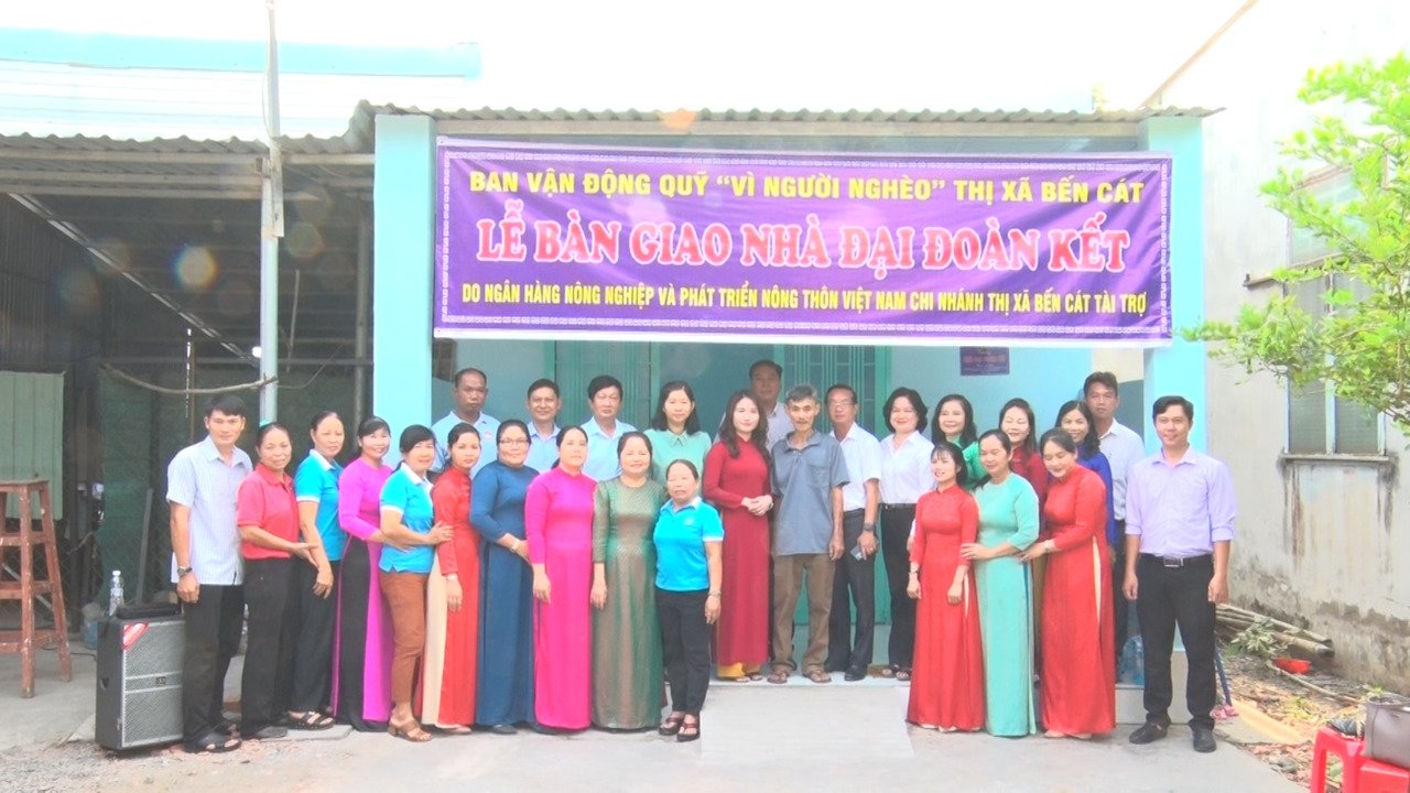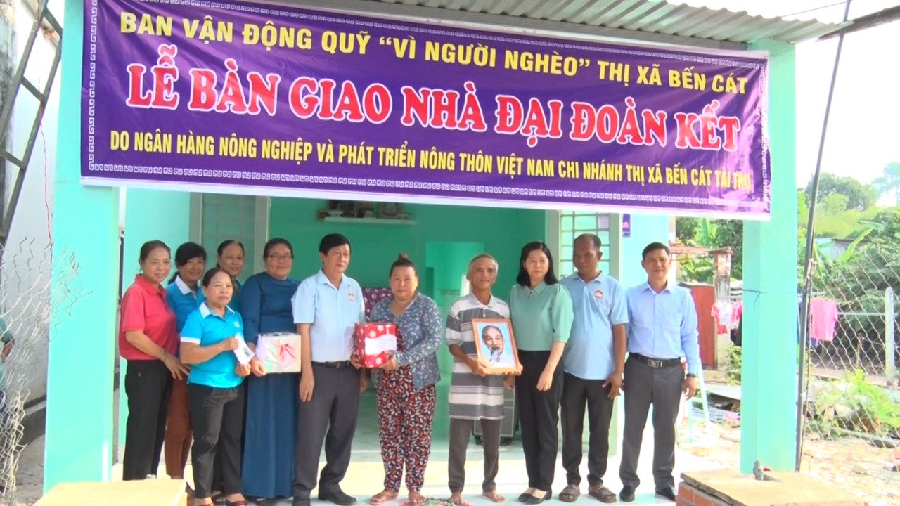 Căn nhà thứ hai được trao cho ông Võ Thành Nhân ngụ ấp Phú Thứ có diện tích 54m2 nền lát gạch men, tường tô, máy tôn với tổng kinh phí 100 triệu đồng, trong đó, 70 triệu đồng do Ngân hàng Nông nghiệp và phát triển nông thôn chi nhánh thị xã Bến Cát tài trợ, phần còn lại trích Quỹ người nghèo thị xã.
