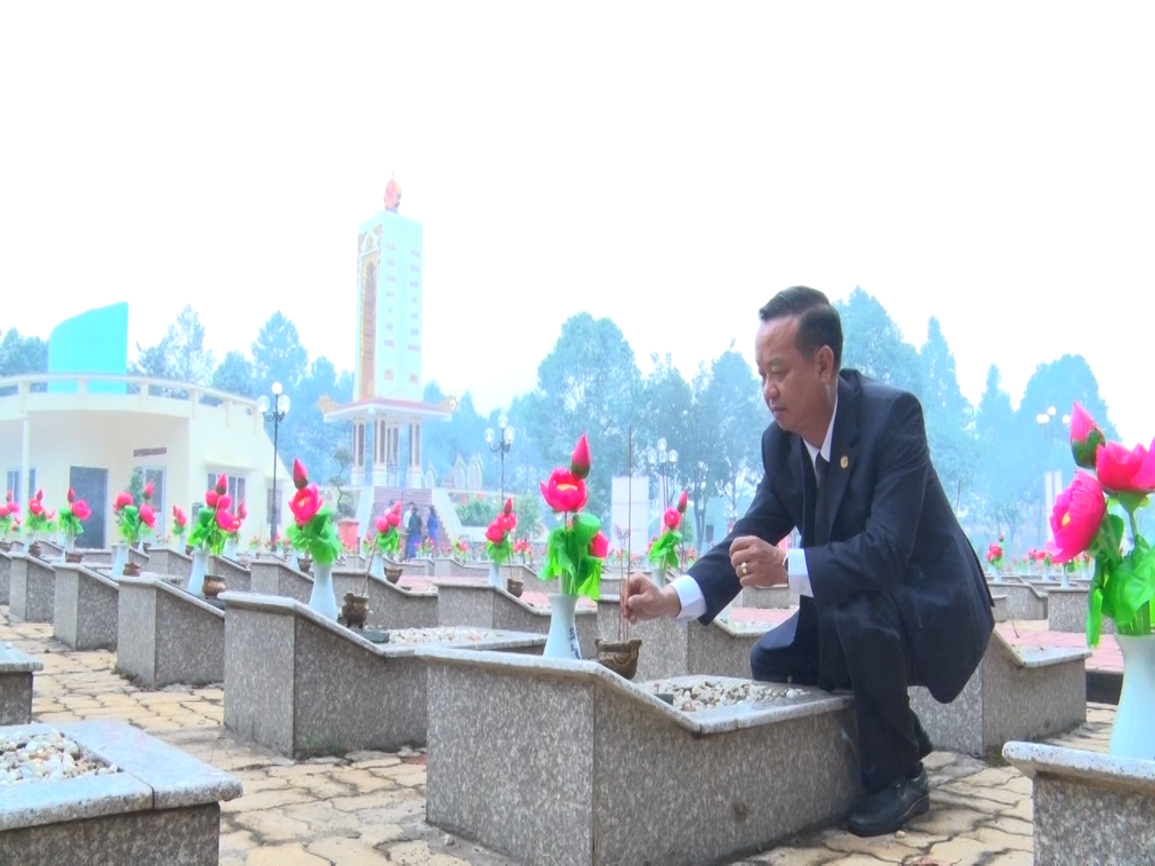Sau lễ viếng, các đồng chí lãnh đạo đã đến thắp hương trên từng phần mộ liệt sĩ.