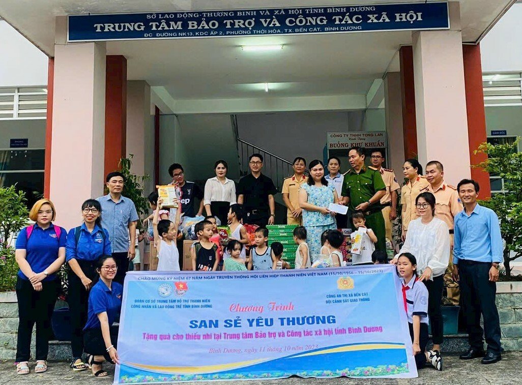 Thiết thực tổ chức các hoạt động chào mừng kỷ niệm 67 năm Ngày truyền thống Hội Liên hiệp Thanh niên Việt Nam (15/10/1956 - 15/10/2023). Chiều ngày 11/10, Đoàn cơ sở Trung tâm Hỗ trợ Thanh niên công nhân và Lao động trẻ tỉnh (KCN Mỹ Phước 3) phối hợp với Đội Cảnh sát giao thông – Công an thị xã Bến Cát tổ chức chương trình “San sẻ yêu thương” tặng quà cho các em thiếu nhi tại Trung tâm Bảo trợ và Công tác xã hội tỉnh trú đóng tại phường Thới Hòa. Tham gia cùng đoàn có ông Đỗ Văn Phùng – Giám đốc Trung tâm, Thượng tá Nguyễn Minh Tấn – Phó trưởng Công an thị xã.