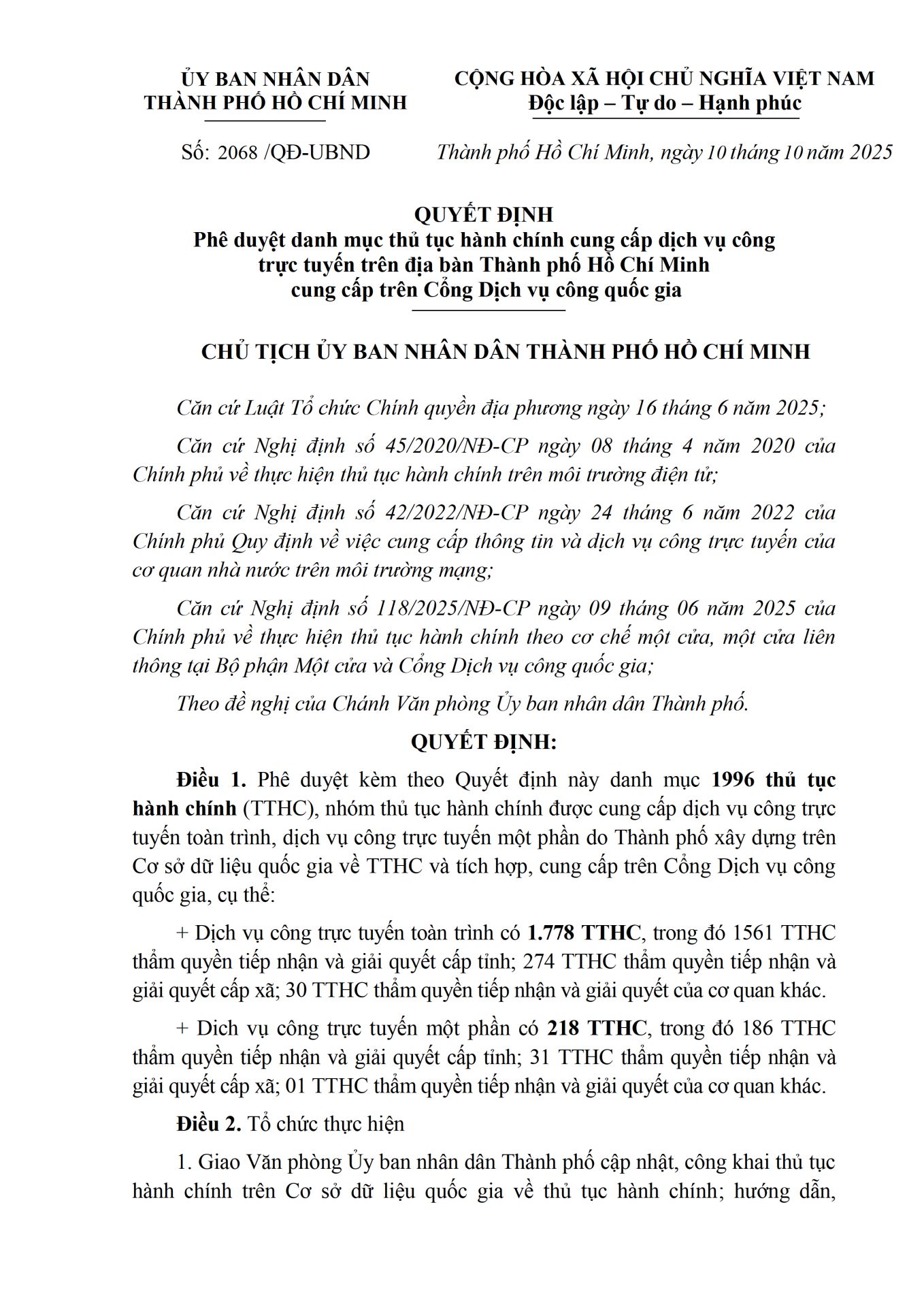 Công bố danh mục thủ tục hành chính cung cấp dịch vụ công trực tuyến trên địa bàn Thành phố Hồ Chí Minhcung cấp trên Cổng Dịch vụ công quốc gia