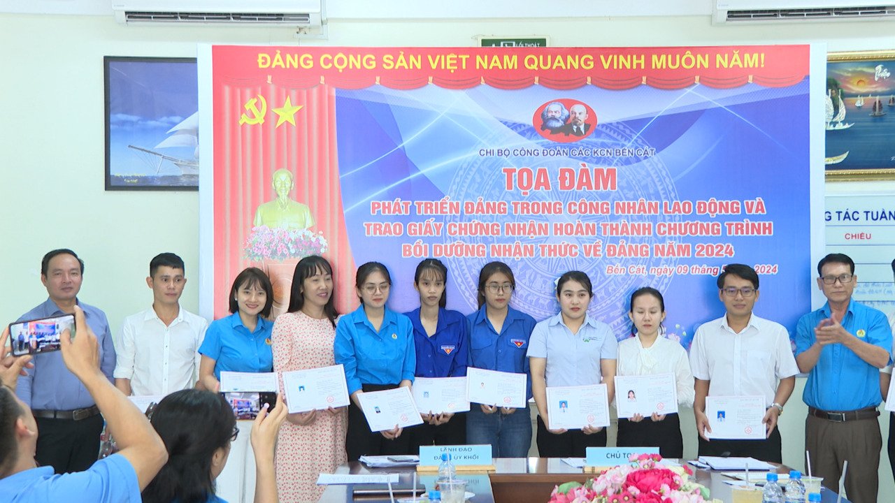 Dịp này, lãnh đạo Đảng ủy Khối và Chi bộ Công đoàn các KCN Bến Cát đã trao giấy chứng nhận chương trình bồi dưỡng nhận thức về Đảng khóa XXIII nhiệm kỳ 2020-2025 cho 33 quần chúng ưu tú.