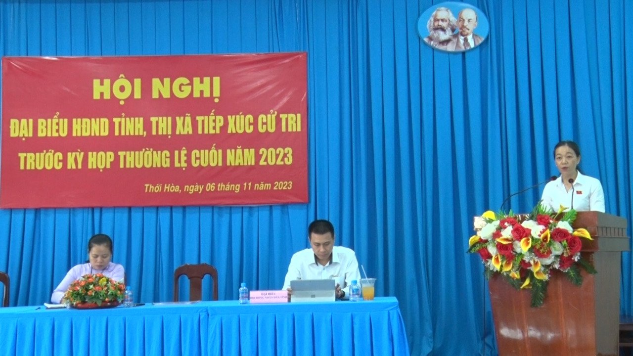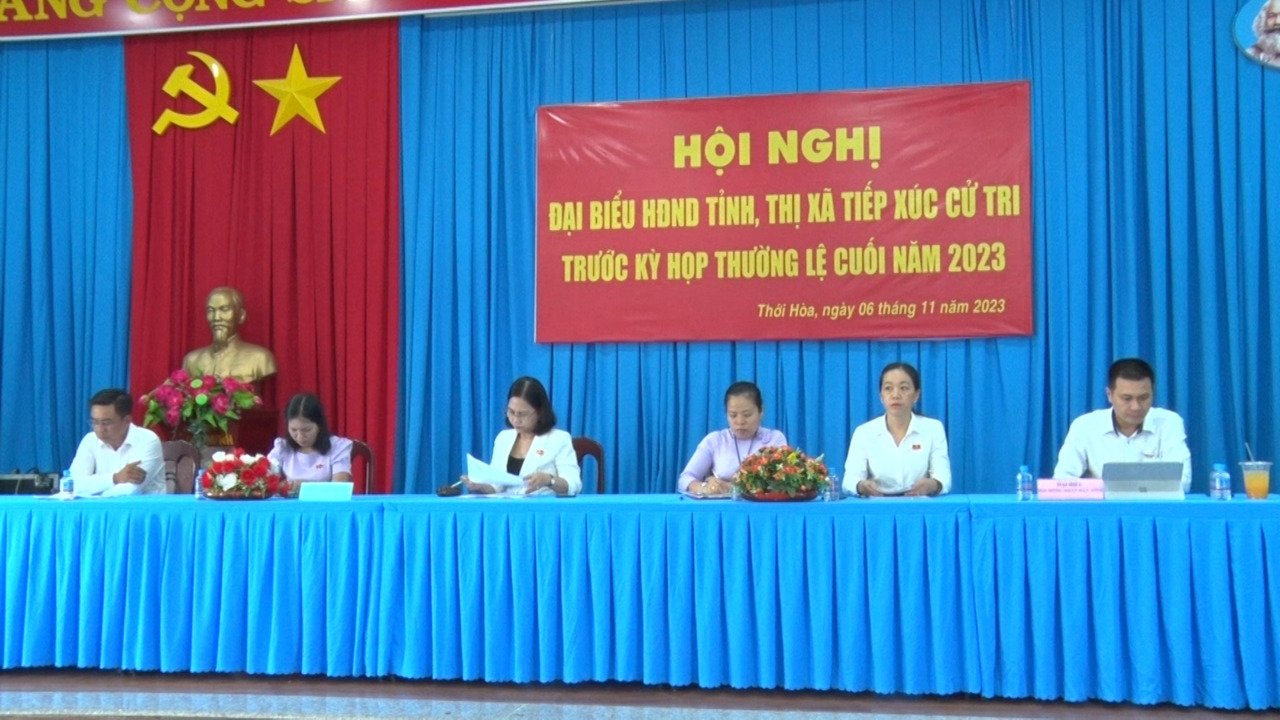 Cũng tại buổi tiếp xúc, cử tri phường Thới Hòa đã kiến nghị với đại biểu HĐND tỉnh, thị xã các nội dung: gắn đèn chiếu sáng trong khu dân cư; 01 số gia đình trong khu dân cư tổ chức hát karaoke gây ồn ào ảnh hưởng đến người xung quanh; giá điện cao; cần khai thông cống rảnh các tuyến đường nông thôn; 01 vài siêu thị bị bỏ trống không hoạt động cần chuyển sang công năng khác để tránh lãng phí; bệnh viện 1.500 giường cần sớm đưa vào hoạt động để phục vụ người dân…