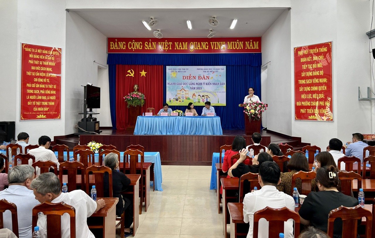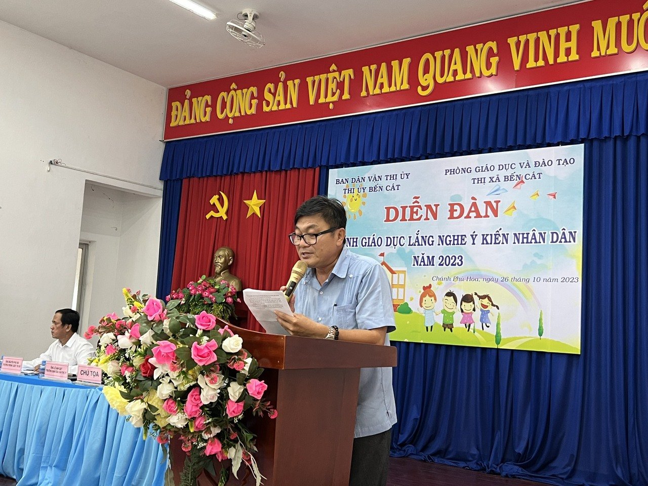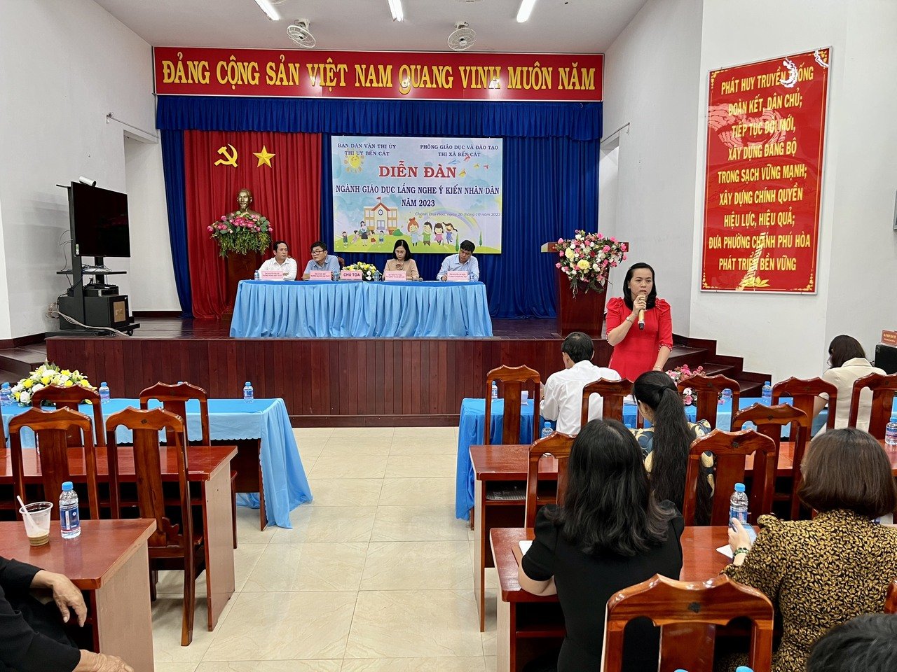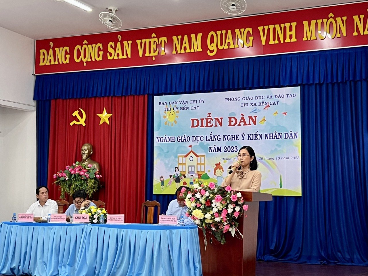 Tại diễn đàn, các đại biểu và người dân được nghe báo cáo tóm tắt kết quả tổng hợp các ý kiến của ngành Giáo dục, báo cáo kết quả năm học 2022-2023. Theo báo cáo, thị xã Bến Cát hiện có 81 trường học, trong đó có 53 trường mầm non, 19 trường tiểu học và 09 trường trung học cơ sở với tổng số hơn 63.500 học sinh. Công tác xã hội hóa giáo dục được đẩy mạnh, nhất là ở bậc mầm non.