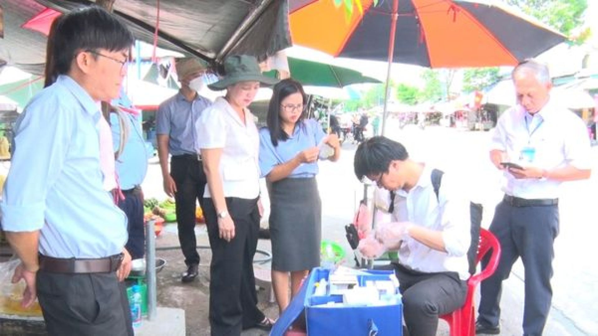 Dịp này, đoàn đã giám sát trực tiếp và lấy mẫu test nhanh hàn the, fomol, dư lượng thuốc bảo vệ thực vật một số thực phẩm, rau, củ, quả như: mì vàng, bún, trái cây…