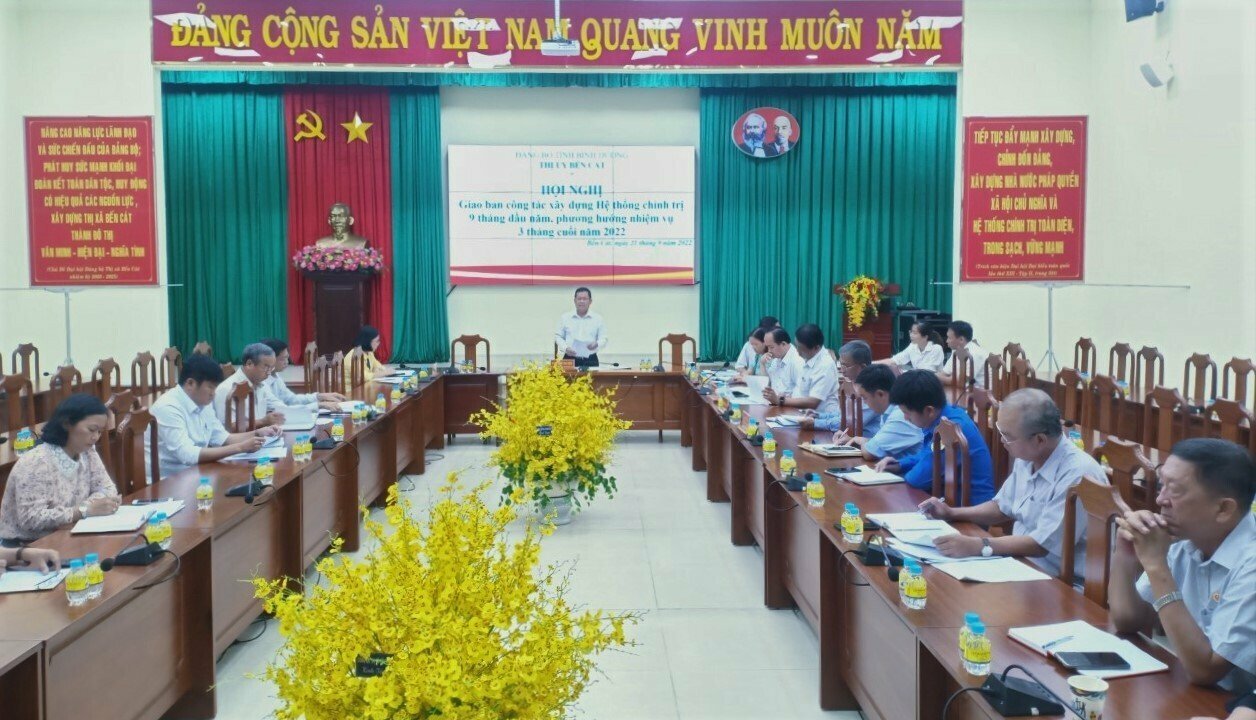 Trong 3 tháng cuối năm 2022, Thị ủy Bến Cát tiếp tục chỉ đạo công tác nắm bắt diễn biến tình hình tư tưởng, tâm tư nguyện vọng chính đáng của cán bộ, đảng viên, Nhân dân trên địa bàn thị xã để định hướng công tác tư tưởng; tổ chức hội nghị quán triệt, học tập các Nghị quyết Hội nghị Trung ương 5, khóa XIII. Tổ chức Hội nghị đối thoại giữa đồng chí Bí thư, đồng chí Chủ tịch Hội đồng nhân dân, đồng chí Chủ tịch Ủy ban nhân dân thị xã về tình hình an ninh trật tự, an sinh xã hội trên địa bàn thị xã và công tác quản lý đất đai, vệ sinh môi trường và các vấn đề khác mà người dân quan tâm. Bên cạnh đó, triển khai Cuộc vận động “Toàn dân đoàn kết xây dựng nông thôn mới, đô thị văn minh”; tổ chức cho đại biểu Quốc hội, đại biểu HĐND tỉnh, thị xã tiếp xúc cử tri trước và sau kỳ họp thường lệ cuối năm 2022; phối hợp tổ chức Ngày hội đại đoàn kết toàn dân tộc năm 2022…