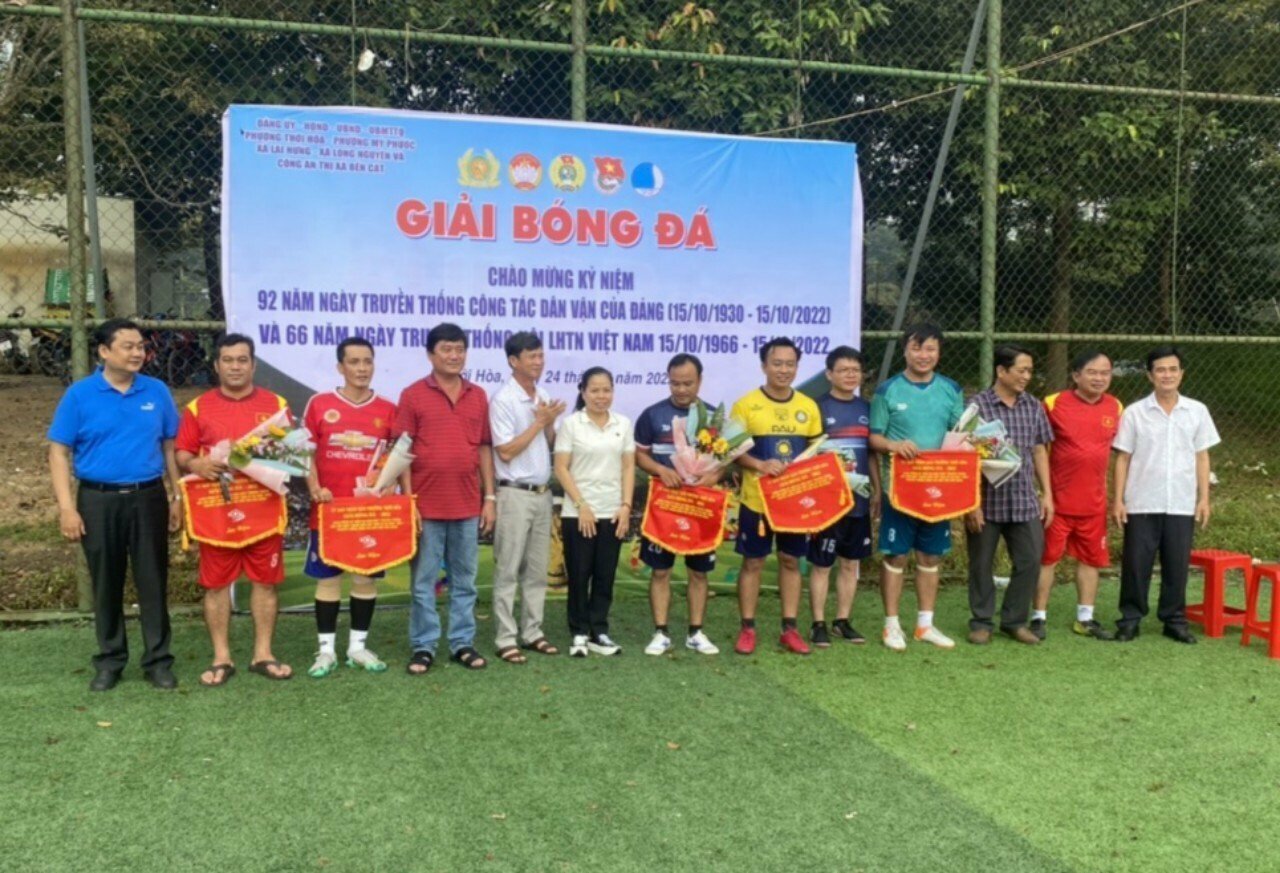 Ngày 24/9, tại sân bóng đá Đại Hoàng Cung, Phường Thới hòa, Phường Mỹ Phước (thị xã Bến Cát), xã Lai Hưng, xã Long Nguyên (huyện Bàu Bàng) và Công an thị xã Bến Cát đã phối hợp tổ chức giải bóng đá chào mừng 92 năm Ngày truyền thống công tác Dân vận của Đảng (15/10/1930 – 15/10/2022) và 66 năm ngày truyền thống Hội LHTN Việt Nam (15/10/1956 – 15/10/2022).