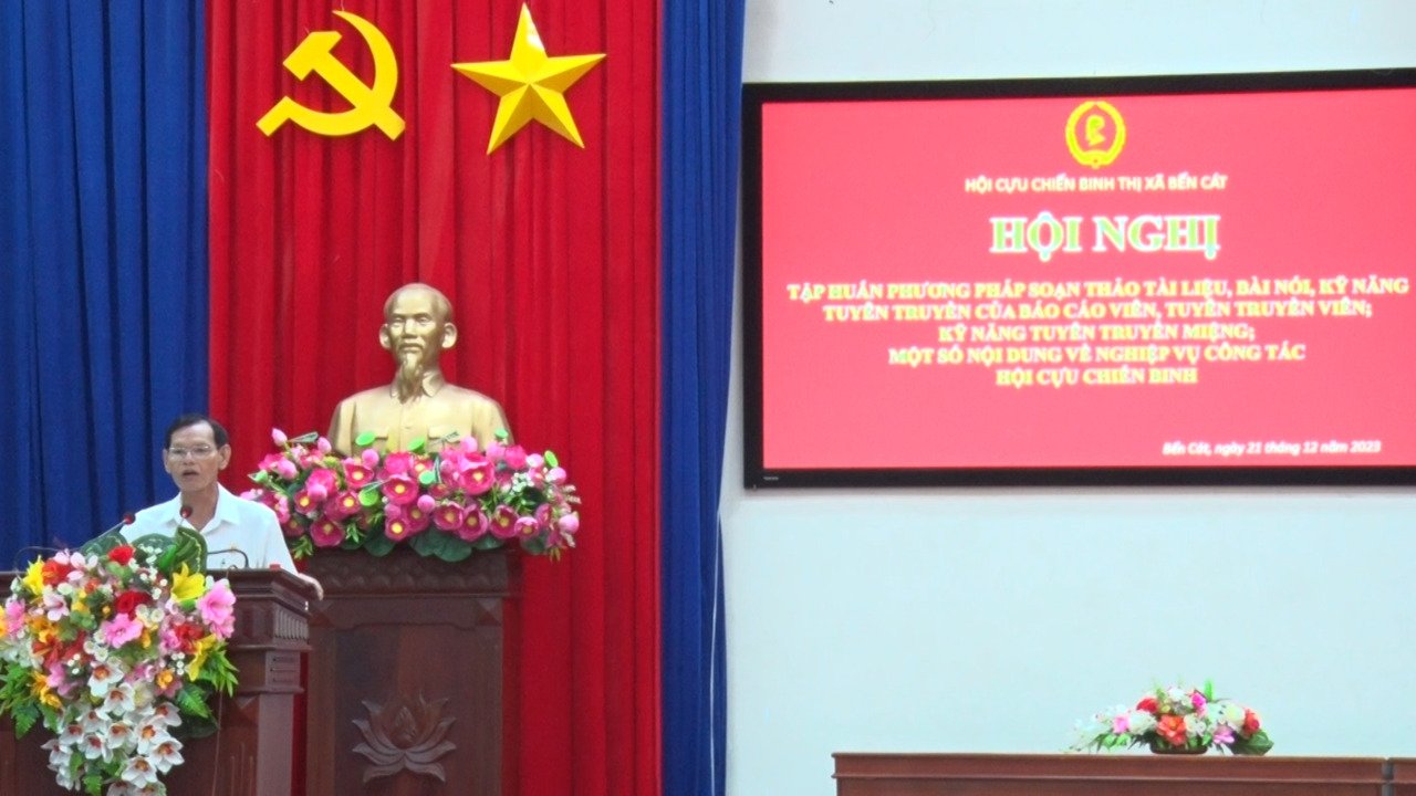 Ngày 21/12, Hội Cựu chiến binh thị xã Bến Cát tổ chức tập huấn phương pháp soạn thảo tài liệu, bài nói, kỹ năng tuyên truyền của báo cáo viên, tuyên truyền viên; kỹ năng tuyên truyền miệng; một số nội dung về nghiệp vụ công tác Hội cho Chủ tịch, Phó Chủ tịch Hội Cựu chiến binh các xã, phường; Chi hội trưởng, Chi hội phó Cựu chiến binh ấp, khu phố và thành viên tuyên truyền cựu chiến binh.