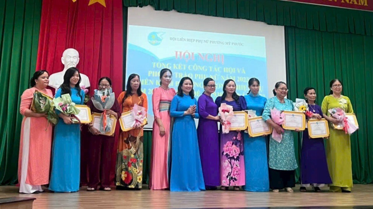 Dịp này, Hội LHPN phường Mỹ Phước trao tặng giấy khen cho 09 cá nhân có thành tích hoàn thành xuất sắc nhiệm vụ công tác hội và phong trào phụ nữ năm 2023.