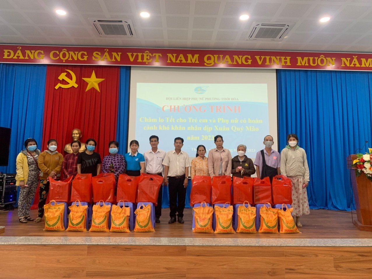 Thiết thực chăm lo đời sống thanh niên công nhân xa quê và phụ nữ khó khăn, trong 02 ngày 12 và 13/01, Hội LHPN phường Thới Hòa tổ chức chương trình “Xuân gắn kết, Tết sum vầy” trao tặng quà cho nữ công nhân nhà trọ có hoàn cảnh khó khăn không có điều kiện về quê ăn tết, chương trình “Ấm áp tình xuân” chăm lo cho phụ nữ có hoàn cảnh khó khăn nhân và chăm lo Tết cho trẻ em nhân dịp Tết Quý Mão năm 2023.