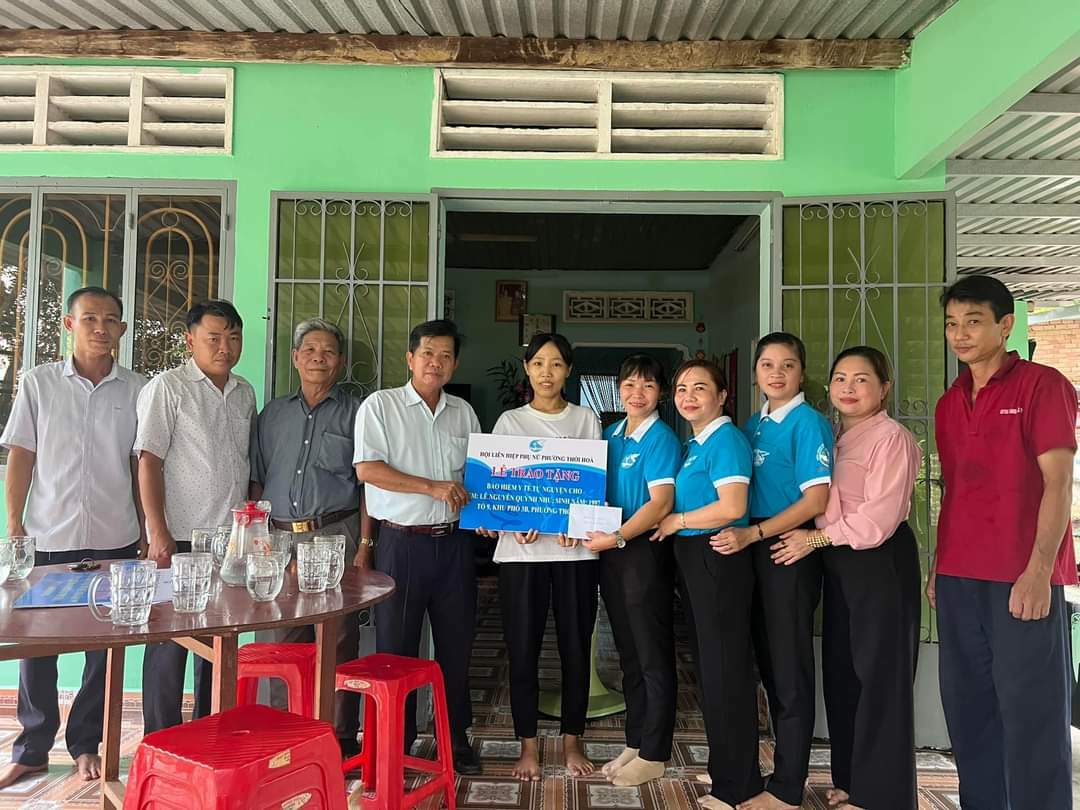 Tại đây, Hội LHPN phường Thới Hòa phối hợp cùng mạnh thường quân thăm hỏi sức khỏe, động viên tinh thần đồng thời trao tặng 01 thẻ BHYT cùng 01 sổ tiết kiệm trị giá 06 triệu đồng và 01 triệu đồng tiền mặt cho cháu Lê Nguyễn Quỳnh Như.