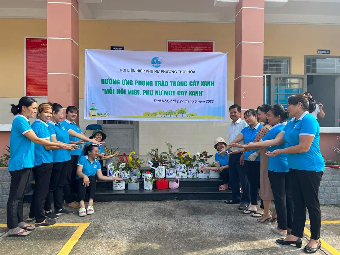 Hưởng ứng phong trào trồng cây xanh “Mỗi hội viên, phụ nữ một cây xanh”, ngày 27/5, Hội LHPN phường Thới Hoà ra quân thực hiện mô hình trồng cây xanh bằng những sản phẩm tái chế từ can nhựa.