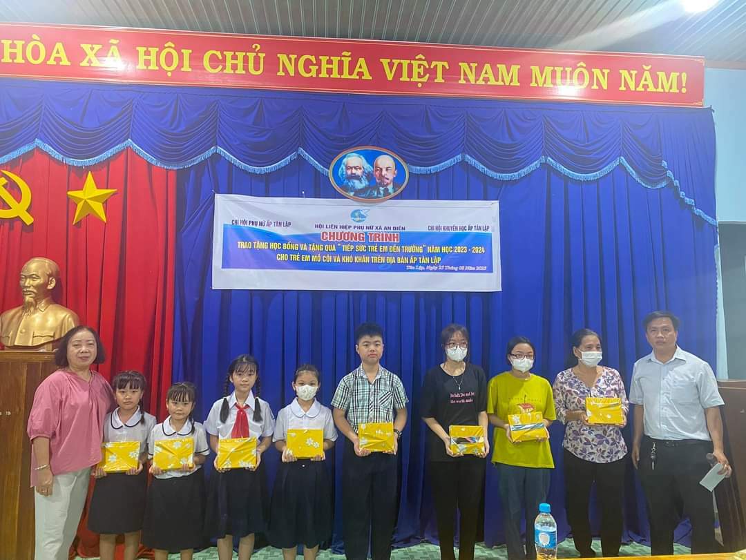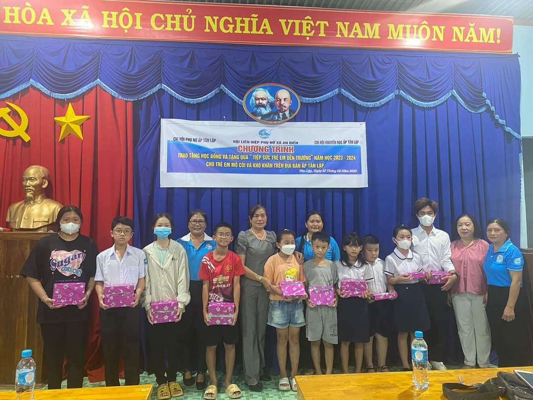 Dịp này, Hội LHPN xã An Điền trao tặng 120 phần quà cho học sinh có thành tích xuất sắc, học sinh nghèo, con hội viên phụ nữ có hoàn cảnh khó khăn trên địa bàn ấp Tân Lập với tổng trị giá 12 triệu đồng.