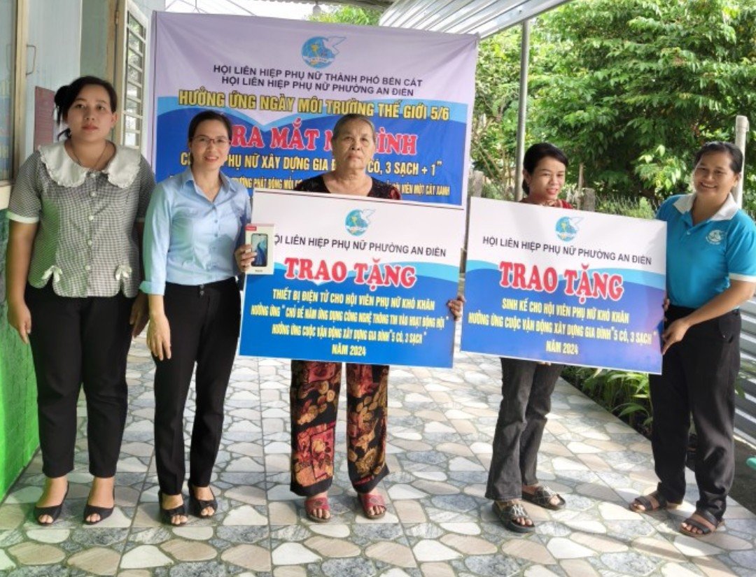 Dịp này, Hội LHPN phường An Điền vận động nhà hảo tâm trao tặng 1 thiết bị điện tử và 1 sinh kế cho hội viên phụ nữ khó khăn với tổng trị giá 4.000.000 đồng và 35 bảng đăng ký thực hiện các tiêu chí “5 có 3 sạch”; chủ nhiệm mô hình “Ươm cây giống trồng cây xanh” trao tặng 500 cây xanh cho các chi hội và hội viên.