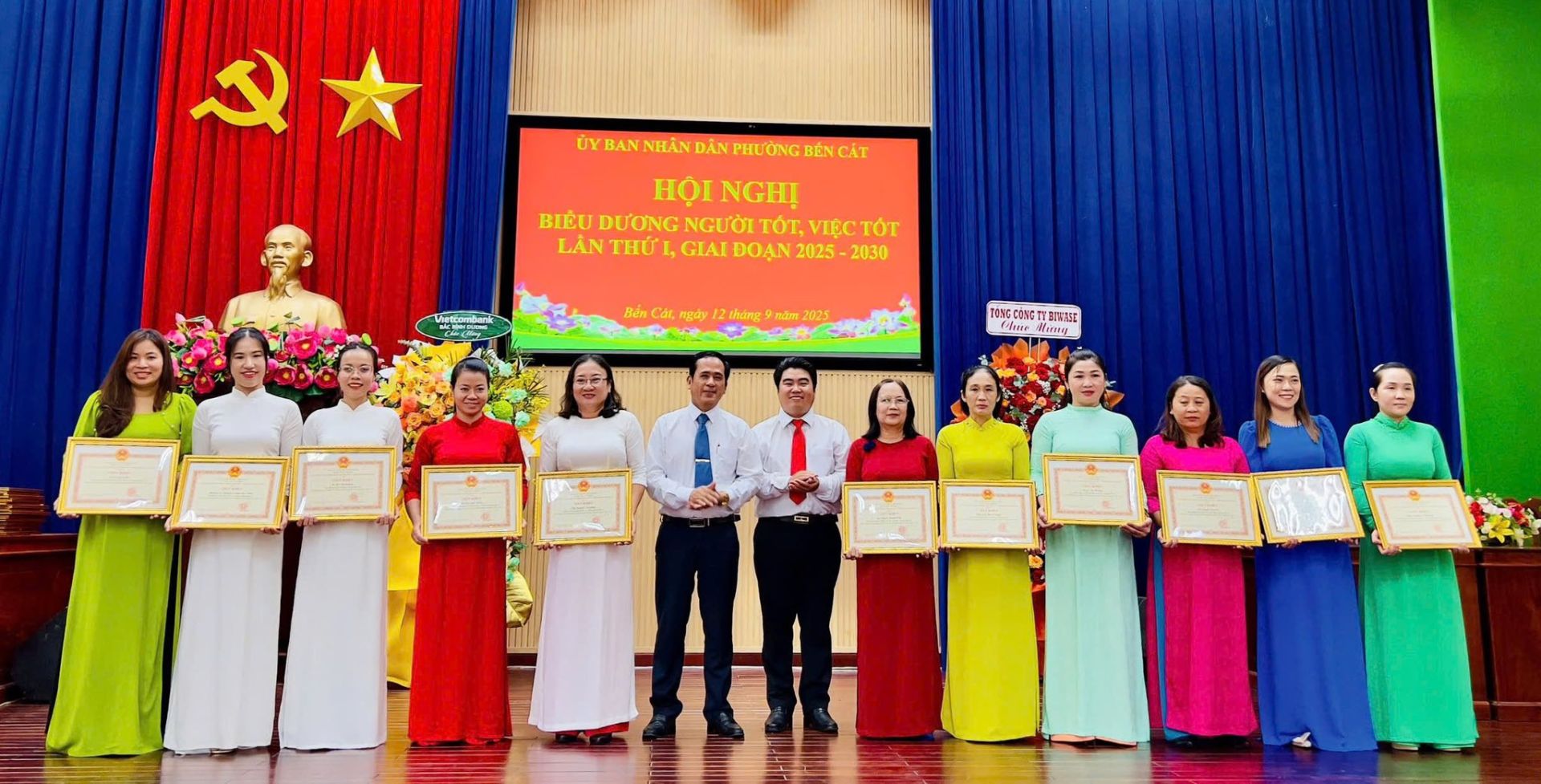 Ngày 12/9, Ủy ban Nhân dân phường Bến Cát long trọng tổ chức Hội nghị Biểu dương người tốt, việc tốt lần thứ I, giai đoạn 2025 – 2030, tiến tới Đại hội Thi đua yêu nước toàn quốc lần thứ XI năm 2025. Tham dự Hội nghị có ông Nguyễn Phú Hải – Ủy viên Ban Thường vụ, Phó Chủ tịch UBND phường, cùng đại diện lãnh đạo các ban, ngành, đoàn thể, cán bộ, công chức, viên chức và nhân dân trên địa bàn.