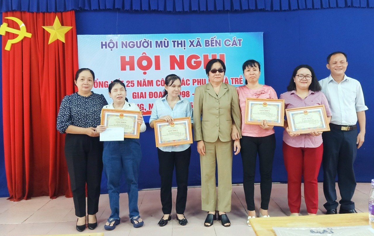 Trong 25 năm qua, Hội Người mù thị xã Bến Cát đã có nhiều nỗ lực, cố gắng tổ chức các hoạt động phong phú và thiết thực chăm lo đời sống, dạy chữ, dạy nghề và tạo việc làm cho phụ nữ mù trên địa bàn thị xã từng bước vươn lên và ổn định cuộc sống. Cụ thể, Hội đã lập dự án từ nguồn quỹ Quốc gia giải quyết việc làm theo kênh Trung ương Hội và kênh địa phương, giải quyết cho gần 100 lượt phụ nữ mù vay vốn với số tiền gần 1 tỷ đồng để tạo thêm việc làm, phát triển kinh tế; xây dựng, sửa chữa 16 căn nhà đại đoàn kết; trợ cấp khó khăn, đột xuất cho 626 lượt phụ nữ mù; cử 13 phụ nữ tham gia học nghề xoa bóp và làm chổi. Hiện có 05 chị làm việc tại cơ sở xoa bóp có thu nhập ổn định.