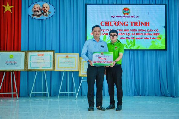 Nhân dịp này, Hội Nông dân xã Phú An đã trao 30 phần quà cho hội viên nông dân có hoàn cảnh khó khăn và trao tặng 300 quyển tập trắng cho Hội Nông dân xã Đông Hòa Hiệp để ủng hộ trẻ em nghèo vượt khó trong học tập với tổng trị giá hơn 12.000.000 đồng.