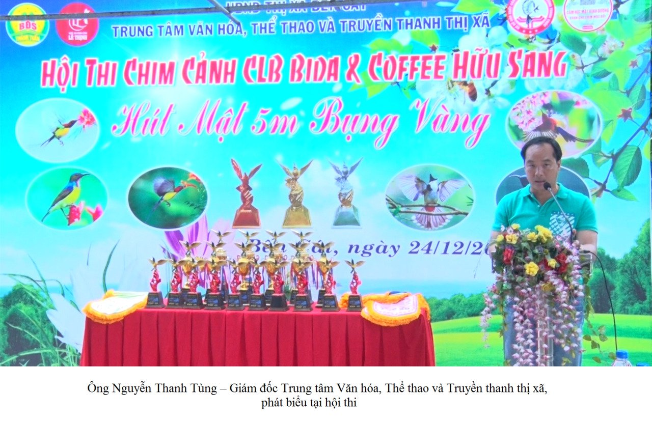 Ngày 24/12, Trung tâm Văn hóa, Thể thao và Truyền thanh thị xã Bến Cát phối hợp cùng Câu lạc bộ bida – Cà phê Hữu Sang tổ chức hội thi “Chim hút mật 5 màu bụng vàng” mở rộng lần thứ nhất năm 2023. Đến dự có ông Nguyễn Thanh Tùng – Giám đốc Trung tâm Văn hóa, Thể thao và Truyền thanh thị xã.