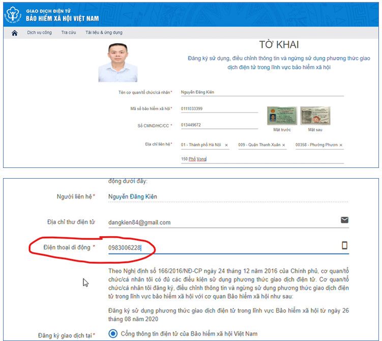 Tại đây, sau khi cập nhật Ảnh cá nhân và ảnh Chứng minh nhân dân/ căn cước công dân, quý vị tiếp tục hoàn thiện đầy đủ và chính xác các thông tin đăng ký sử dụng phương thức giao dịch điện tử với cơ quan BHXH