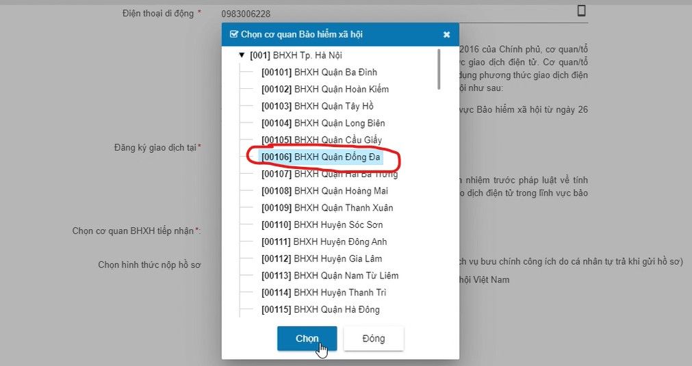 Lựa chọn cơ quan BHXH nơi gần nhất để nộp hồ sơ đăng ký giao dịch điện tử.