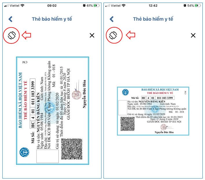 Nhấn vào “Xem thẻ Bảo hiểm y tế”, màn hình sẽ hiển thị như hình dưới (có thể lựa chọn xoay để xoay thẻ BHYT cho dễ quan sát):