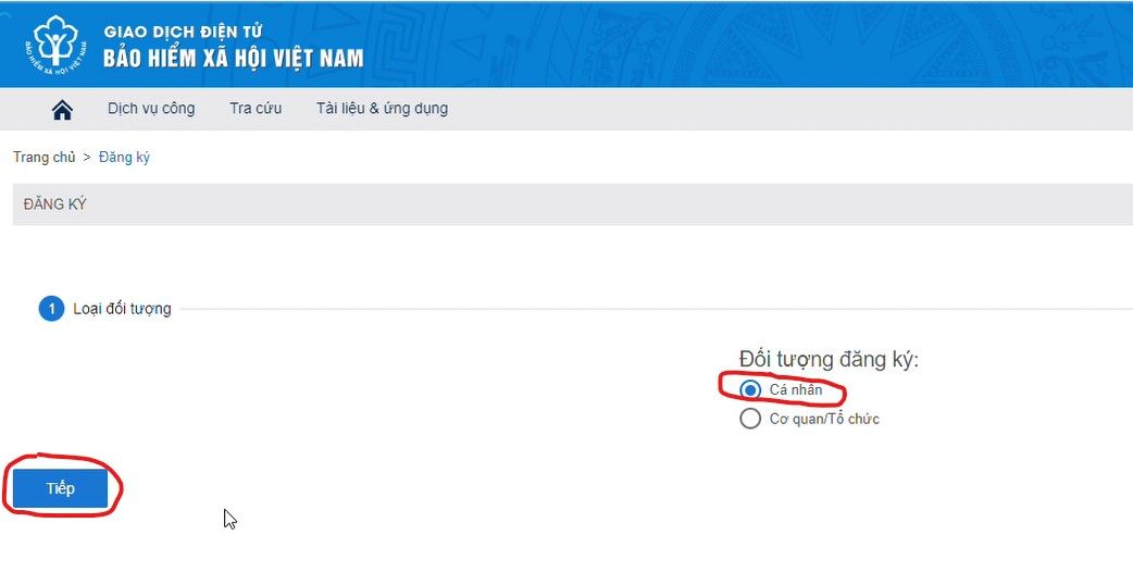 Nhấn ĐĂNG KÝ và chọn đối tượng cá nhân rồi bấm “Tiếp”