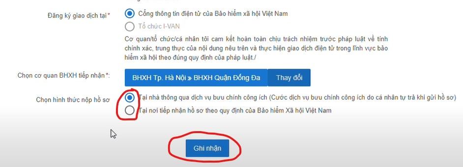 Lựa chọn hình thức để nộp hồ sơ tại bộ phận tiếp nhận hồ sơ (của cơ quan BHXH mà công dân đã chọn ở bước trên).