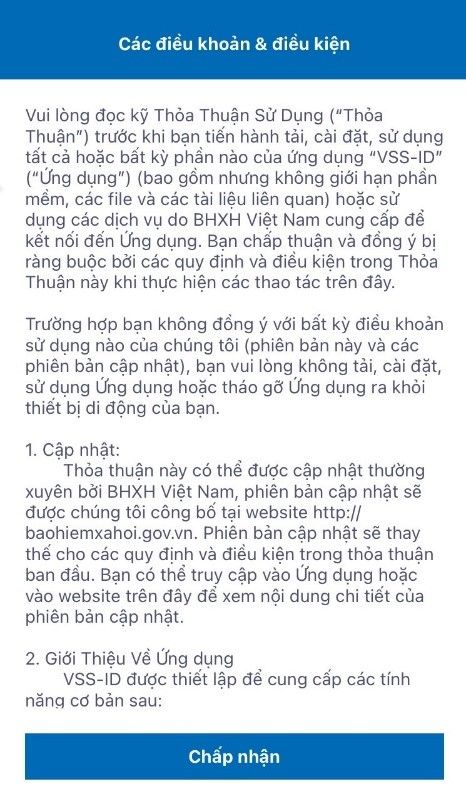Để sử dụng ứng dụng, người dùng phải chấp nhận với các điều khoản và điều kiện của ứng dụng VssID.