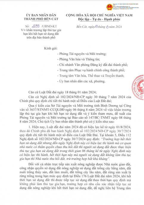 Hiện nay, Luật đất đai năm 2024 đã có hiệu lực kể từ ngày 01/8/2024, theo đó Chính phủ đã ban hành Nghị định số 102/2024/NĐ-CP ngày 30/7/2024 quy định chi tiết thi hành một số điều của Luật Đất Đai. Tại khoản 5, Điều 112 Nghị định số 102/2024/NĐ-CP ngày 30/7/2024 quy định: "Trường hợp hết thời hạn sử dụng đất nhưng đến ngày Nghị định này có hiệu lực thi hành mà cơ quan nhà nước có thẩm quyền chưa thu hồi đất thì người sử dụng đất được thực hiện thủ tục gia hạn sử dụng đất trong thời gian 06 tháng kể từ ngày Nghị định này có hiệu lực thi hành, hết thời hạn này mà người sử dụng đất không làm thủ tục gia hạn thì Nhà nước thu hồi đất, trừ trường hợp bất khả kháng".