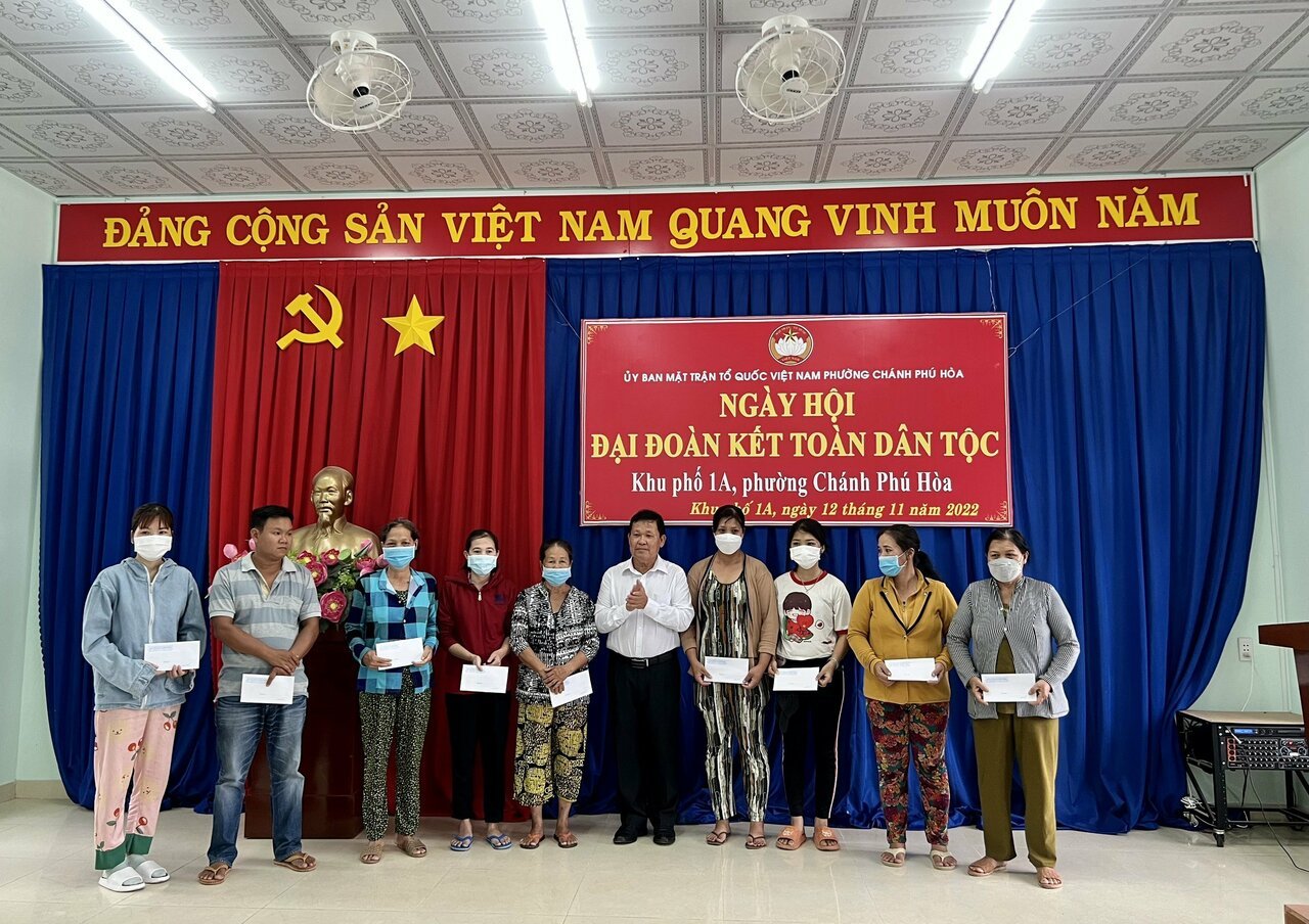 Theo đó, trong năm 2022, Ban Công tác Mặt trận khu phố 1A, phường Chánh Phú Hòa đã vận động nhân dân cùng nhau đoàn kết xây dựng đời sống kinh tế, chung sức xây dựng nông thôn mới, đô thị văn minh; khơi dậy mạnh mẽ tinh thần đoàn kết giúp đỡ nhau giảm nghèo, vươn lên làm giàu chính đáng, bằng các hình thức như giúp nhau về vốn, vật tư, con giống, kinh nghiệm sản xuất, giúp nhau tiếp thu các ứng dụng của khoa học kỹ thuật vào sản xuất, giúp nhau ngày công lao động… Trong năm, vận động các mạnh thường quân hỗ trợ cho các hộ nghèo, khó khăn được 255 phần quà với tổng trị giá trên 76 triệu đồng, trao 05 thẻ bảo hiểm y tế cho các hộ khó khăn, tổ chức 1 phiên chợ 0 đồng với 10 gian hàng trị giá 10 triệu đồng.