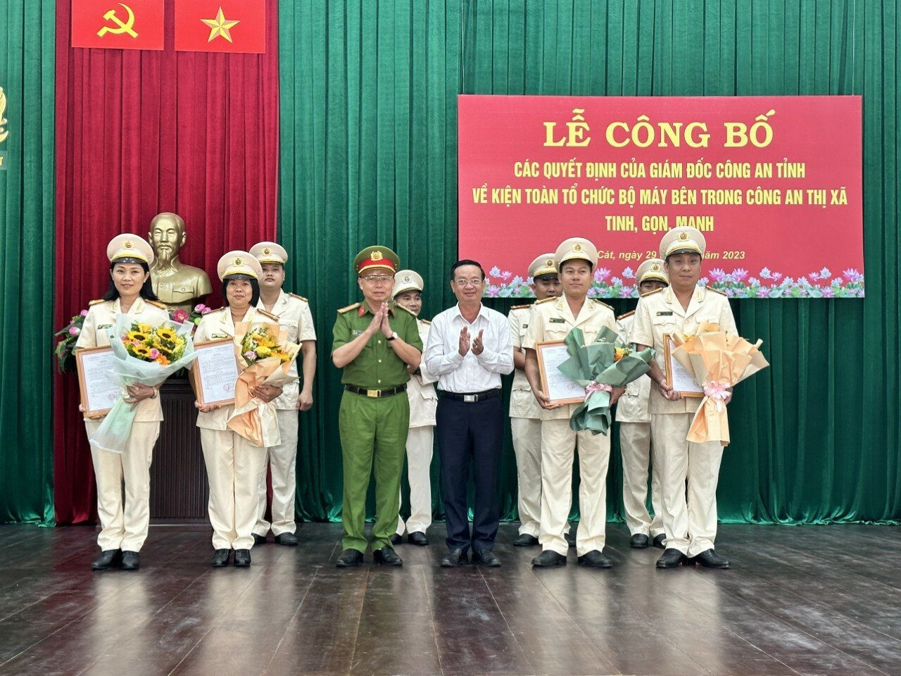 Phát biểu tại lễ công bố Quyết định, Đại tá Trần Văn Chính - Phó Giám đốc Công an tỉnh khẳng định, việc sắp xếp tổ chức bộ máy Công an các đơn vị, địa phương theo chỉ đạo của Bộ trưởng Bộ Công an là phù hợp với tính chất, đặc điểm, chức năng, nhiệm vụ của từng đơn vị địa phương, bảo đảm yêu cầu công tác, chiến đấu và xây dựng lực lượng Công an theo hướng tinh, gọn, mạnh, hiệu lực, hiệu quả, đồng bộ, xuyên suốt, tiết kiệm tối đa biên chế. Tại Công an thị xã, việc sắp xếp, tinh gọn bộ máy trên tinh thần dân chủ, minh bạch, đáp ứng yêu cầu đề ra.