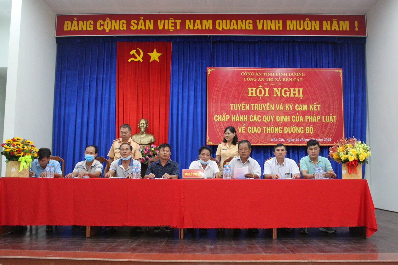 Công an thị xã Bến Cát tổ chức ký cam kết chấp hành các quy định của pháp luật về giao thông đường bộ đối với chủ kinh doanh vận tải gồm các nội dung như: thực hiện đúng các quy định về xếp hàng hóa trên xe ô tô khi tham gia giao thông đường bộ; thực hiện nghiêm việc đăng ký kinh doanh vận tải, làm thủ tục đề nghị cấp phù hiệu gắn phù hiệu cho phương tiện kinh doanh vận tải theo quy định; thực hiện các quy định về bảo vệ môi trường; không giao phương tiện hoặc để người làm công, người đại diện điều khiển phương tiện để chở hàng vượt quá trọng tải cho phép khi tham gia giao thông, chở hàng trên nóc thùng, chở hàng vượt quá bề rộng thùng xe, chở hàng vượt quá phía trước, phía sau thùng xe trên 10% chiều dài xe. Bên cạnh đó, chủ kinh doanh vận tải không đưa phương tiện khi tham gia giao thông không có giấy đăng ký xe, tem kiểm định, giấy chứng nhận kiểm định an toàn kỹ thuật và bảo vệ môi trường của xe hoặc có nhưng đã hết hạn; có kích thước thùng xe không đúng với thông số kỹ thuật được ghi trong giấy chứng nhận kiểm định an toàn kỹ thuật và bảo vệ môi trường của xe…