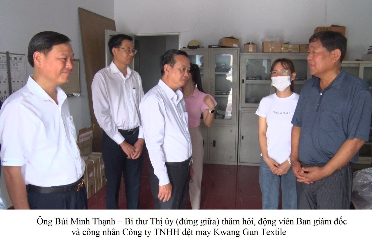 Sáng ngày 12/7, ông Bùi Minh Thạnh – Bí thư Thị ủy, ông Lê Anh Quý – Trưởng Ban Dân vận Thị ủy, Chủ tịch Ủy ban MTTQ Việt Nam thị xã, ông Trần Ngọc Cường – Phó Chủ tịch UBND thị xã, cùng lãnh đạo các phòng, ban, ngành liên quan, lãnh đạo phường Chánh Phú Hòa, đã đến thăm hỏi, động viên Ban giám đốc và công nhân Công ty TNHH dệt may Kwang Gun Textile (khu công nghiệp Mỹ Phước III) bị cháy nhà xưởng.