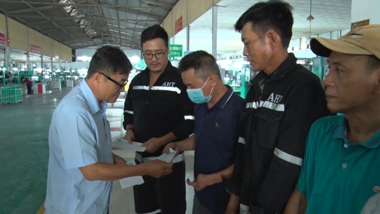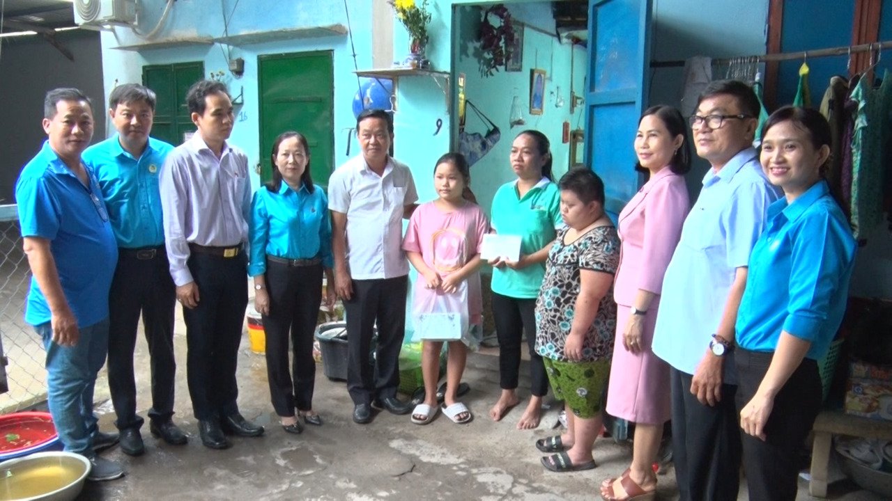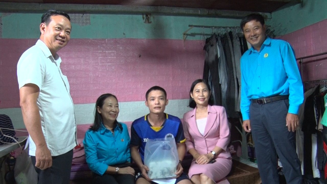 Theo đó, đoàn lãnh đạo trực tiếp đến phòng trọ tặng quà cho 2 công nhân lao động có hoàn cảnh đặc biệt khó khăn đang làm việc tại Công ty TNHH cao su Phong Thái (phường Tân Định) gồm: gia đình chị Đỗ Thị Thủy quê ở Nam Định, vào Bình Dương làm việc được 24 năm. Hoàn cảnh của chị rất khó khăn khi phải chăm sóc con bị bệnh bẩm sinh, chồng chị lại chẳng may bị tai biến phải điều trị dài ngày. Công ty gặp khó khăn nên thu nhập của người lao động như chị Thủy cũng bị giảm đáng kể. Chị Thủy xúc động rơi nước mắt và cảm ơn lãnh đạo LĐLĐ tỉnh, thị xã Bến Cát đã quan tâm, kịp thời chia sẻ khó khăn với người lao động. Có thêm 1 triệu đồng, chị sẽ có thêm 1 khoản để phụ tiền nhà trọ, thuốc men cho chồng. Và người thứ 2 là anh công nhân Nguyễn Văn Phục - quê An Giang. Anh Phục bị tai nạn giao thông gãy 1/3 xương đùi trên, mấy tháng nay anh không thể đi làm.