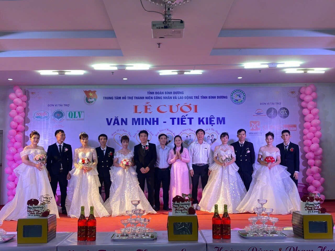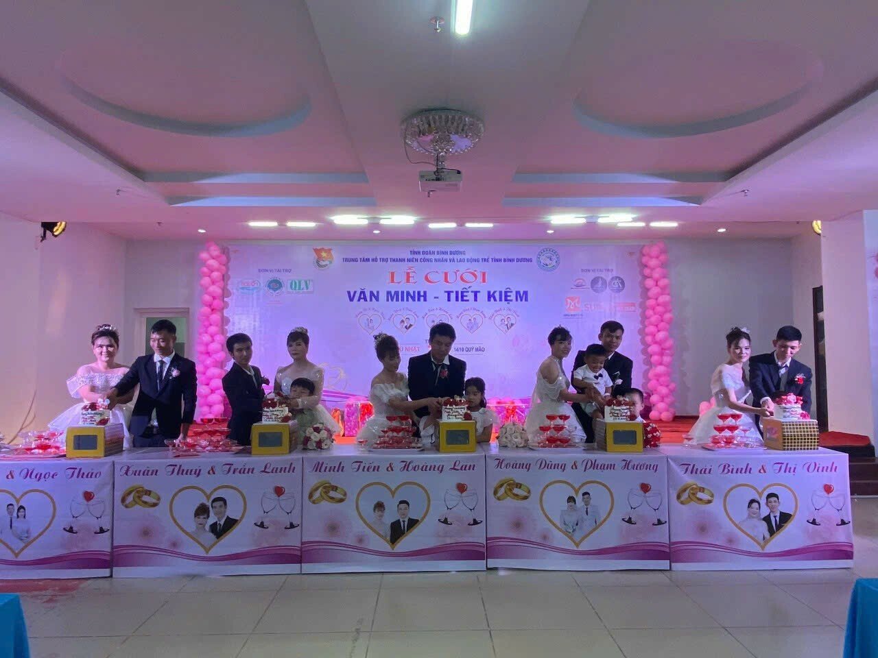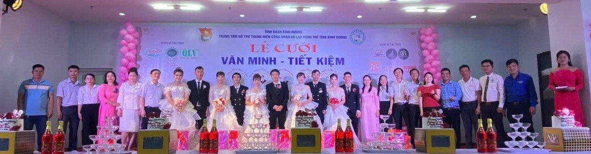 05 cặp đôi tham gia lễ cưới tập thể gồm: cặp đôi Nông Vỹ và Ngọc Thảo, cặp đôi Xuân Thúy và Trần Lanh, cặp đôi Thái Bình và Thị Vinh, cặp đôi Minh Tiến và Hoàng Lan và cặp đôi Hoàng Dũng và Phạm Hương. Tất cả đều là công nhân xa quê đến Bình Dương sinh sống và làm việc. Khi được Trung tâm cùng các doanh nghiệp, đơn vị tổ chức lễ cưới tập thể trong khuôn khổ tiết kiệm, an toàn, họ đều cảm thấy vui tươi, hạnh phúc.
